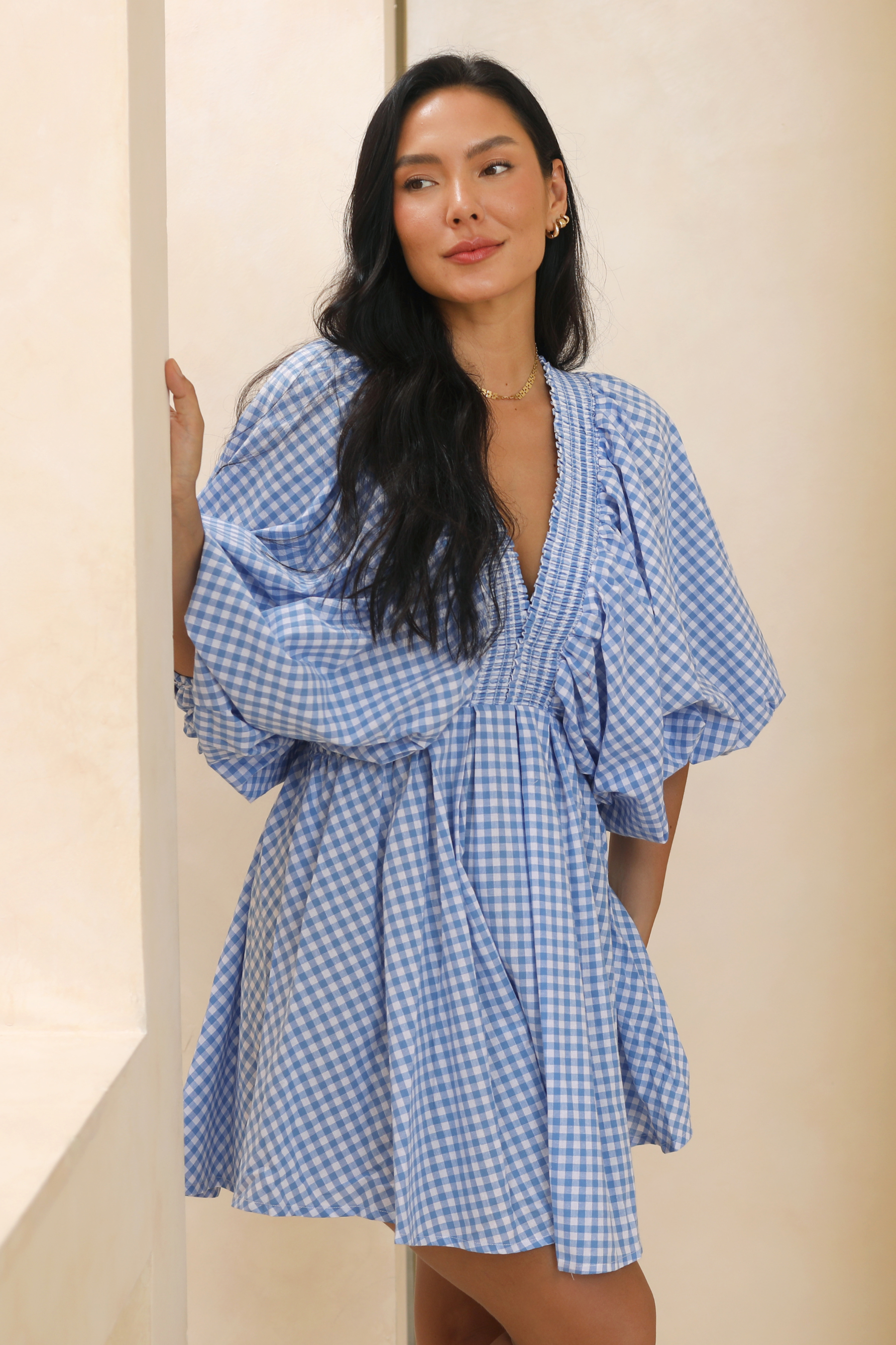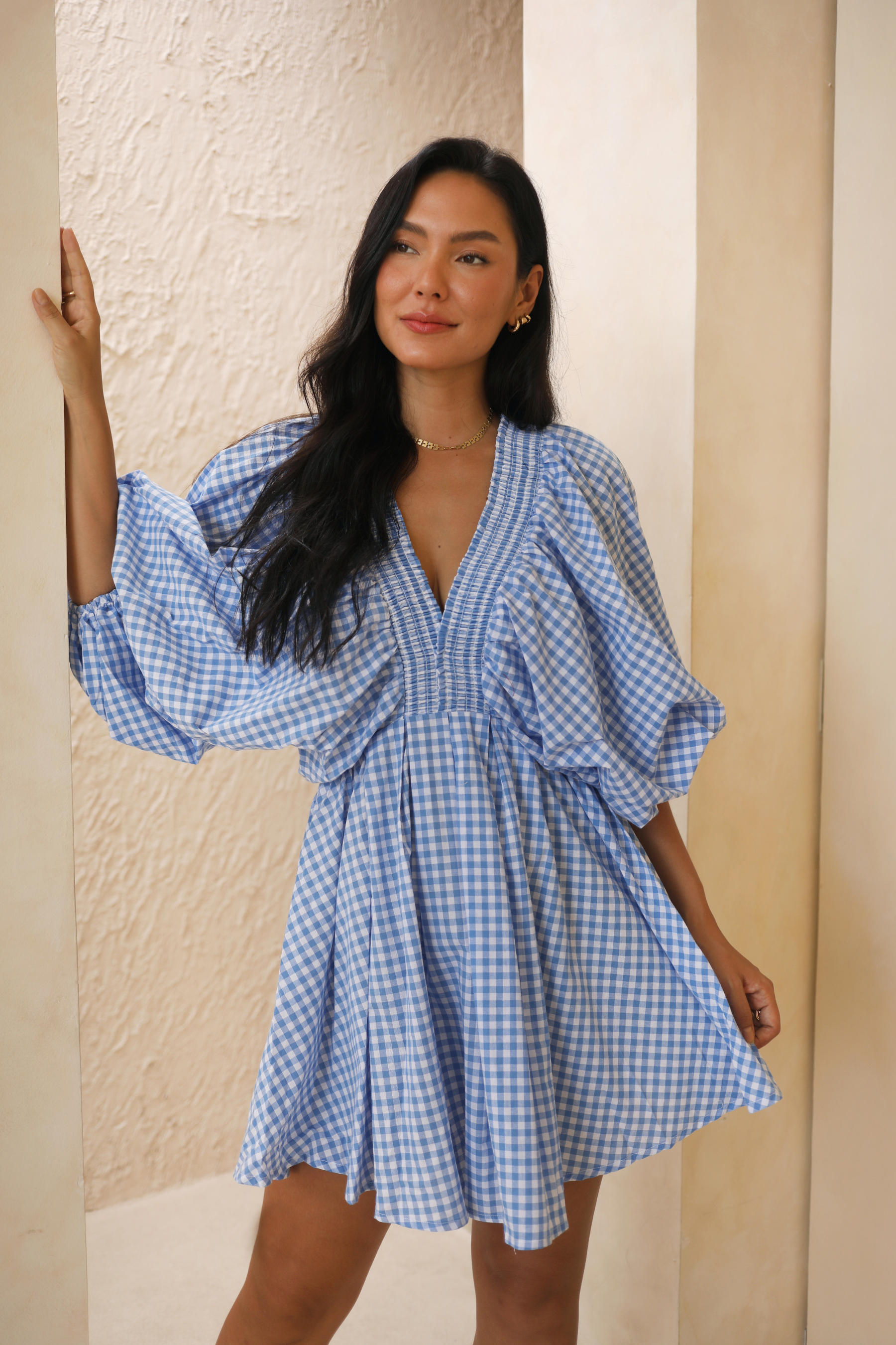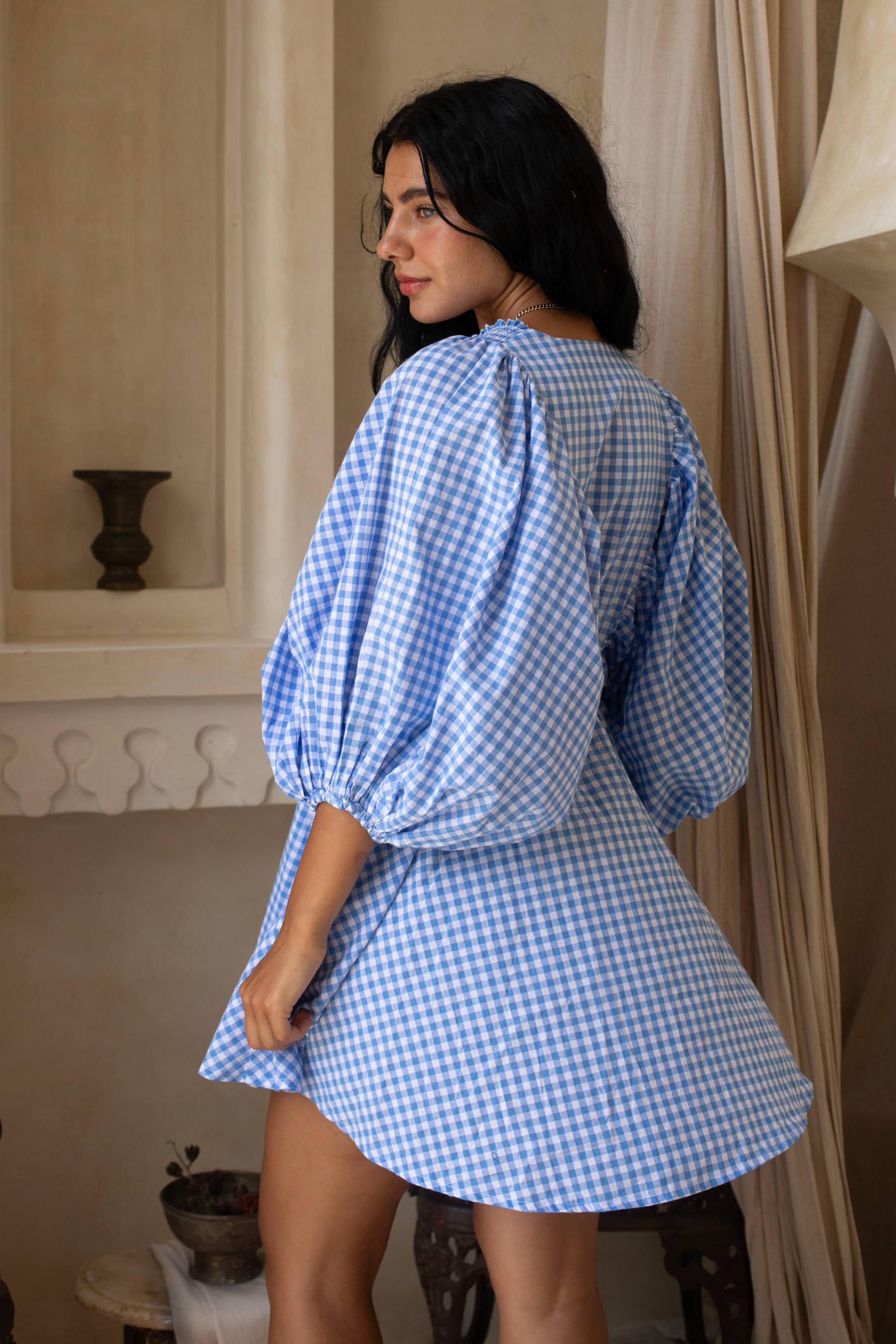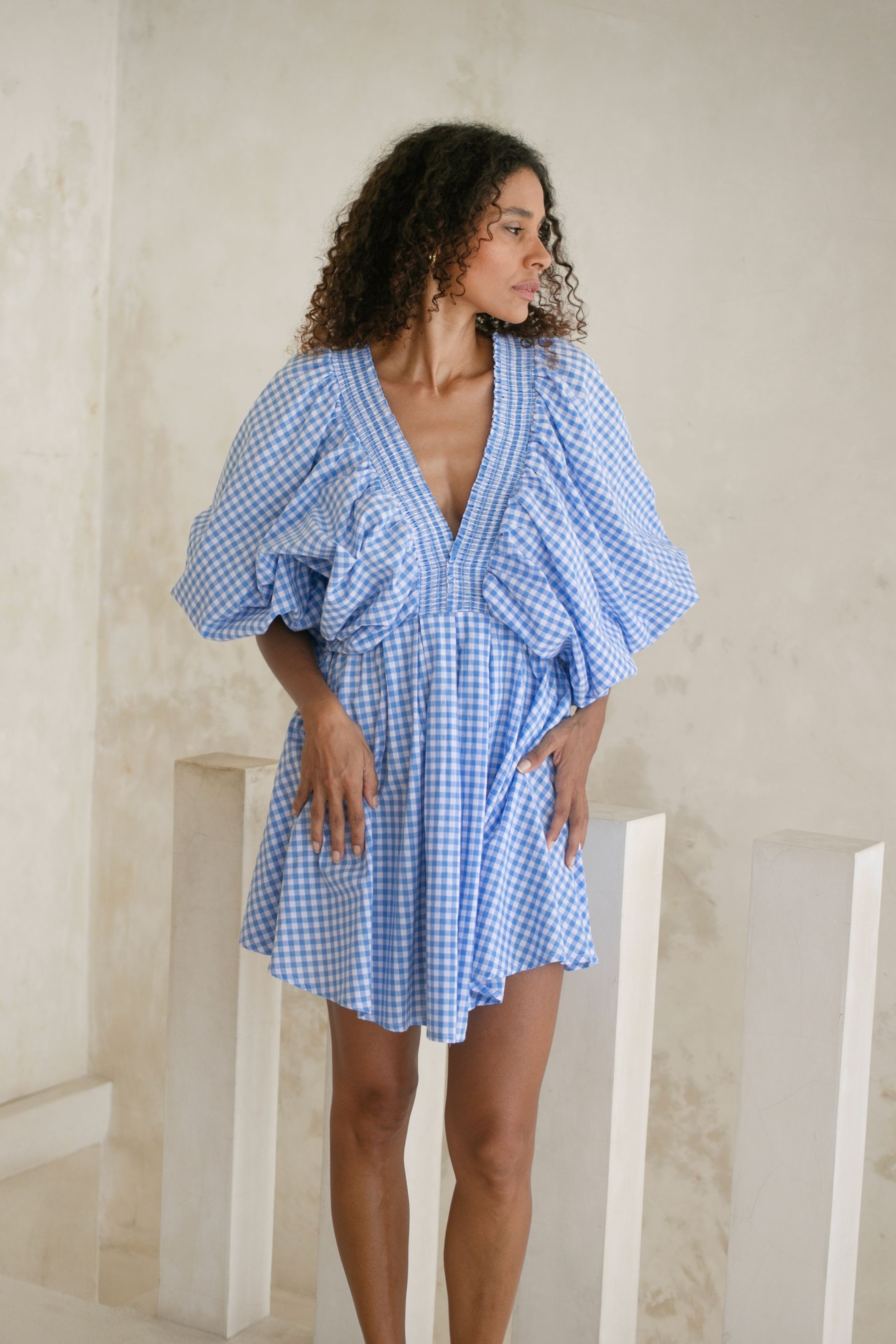 Crafted in an organic cotton timeless gingham print. It features playful balloon sleeves, a shirred neck detail, and a full, feminine skirt that moves with you.