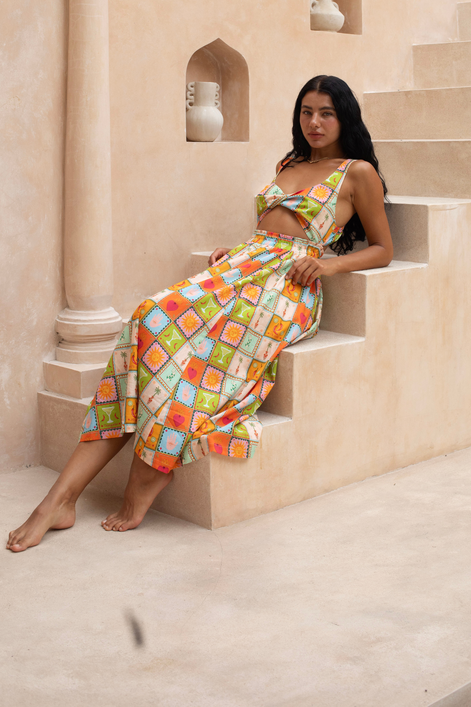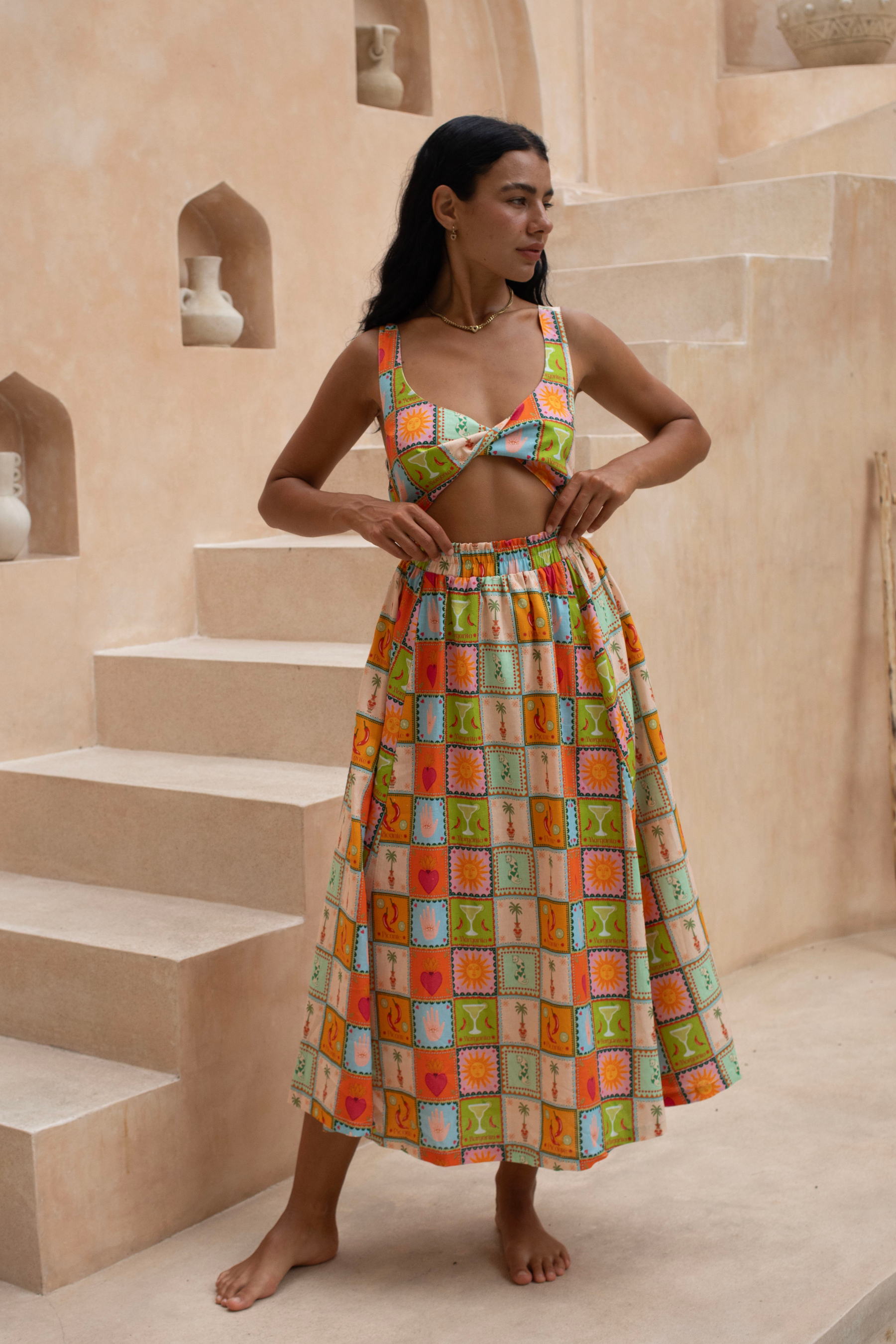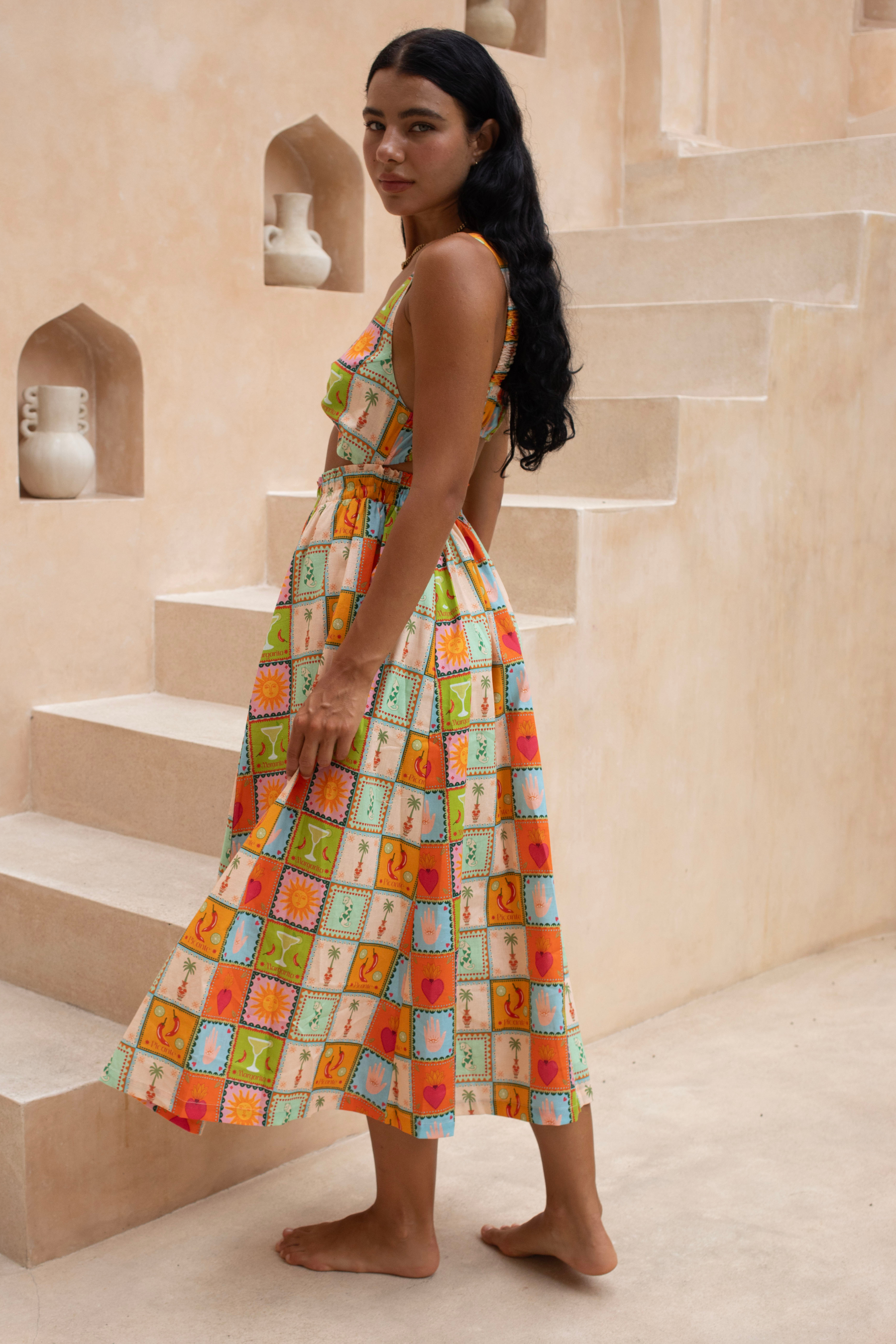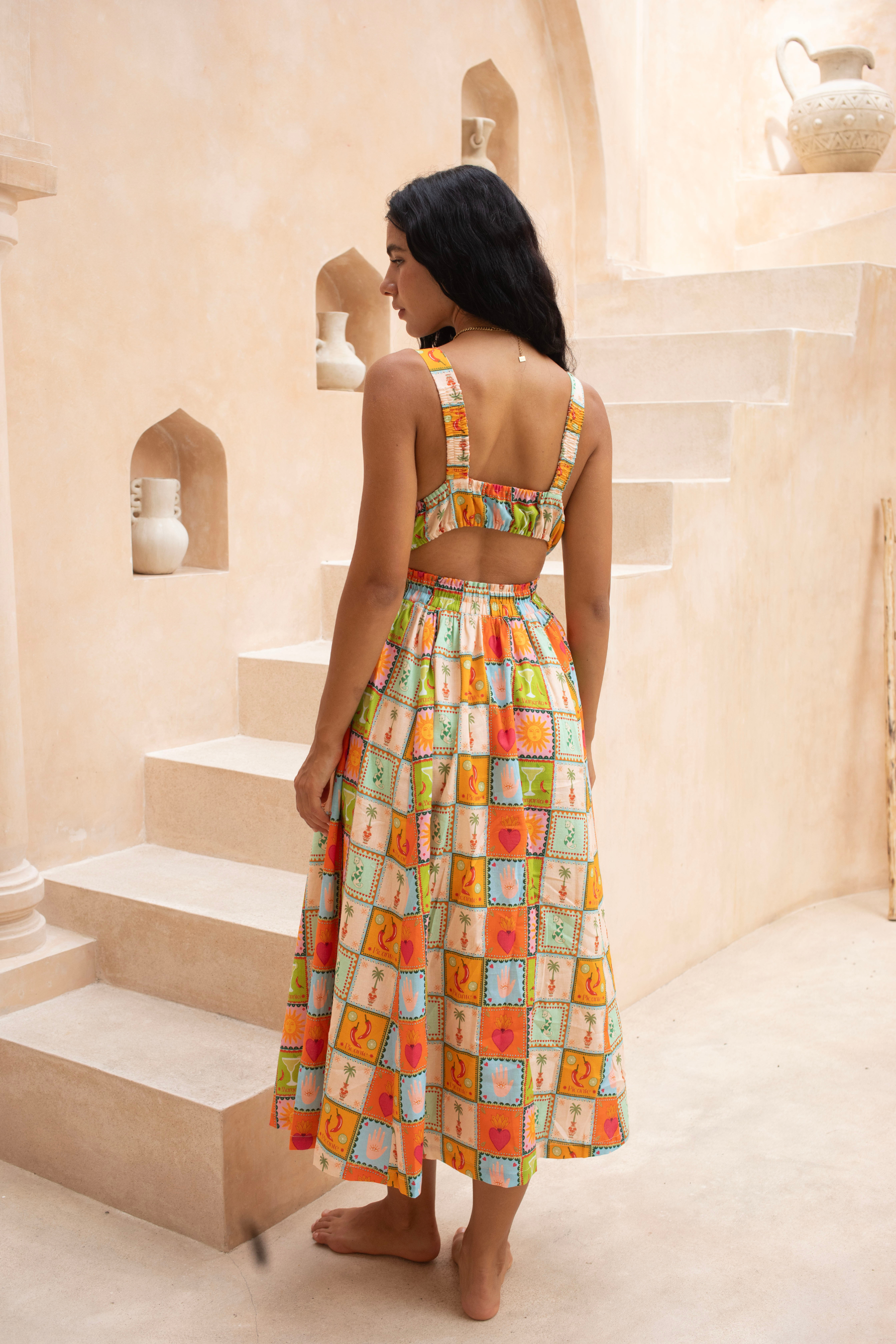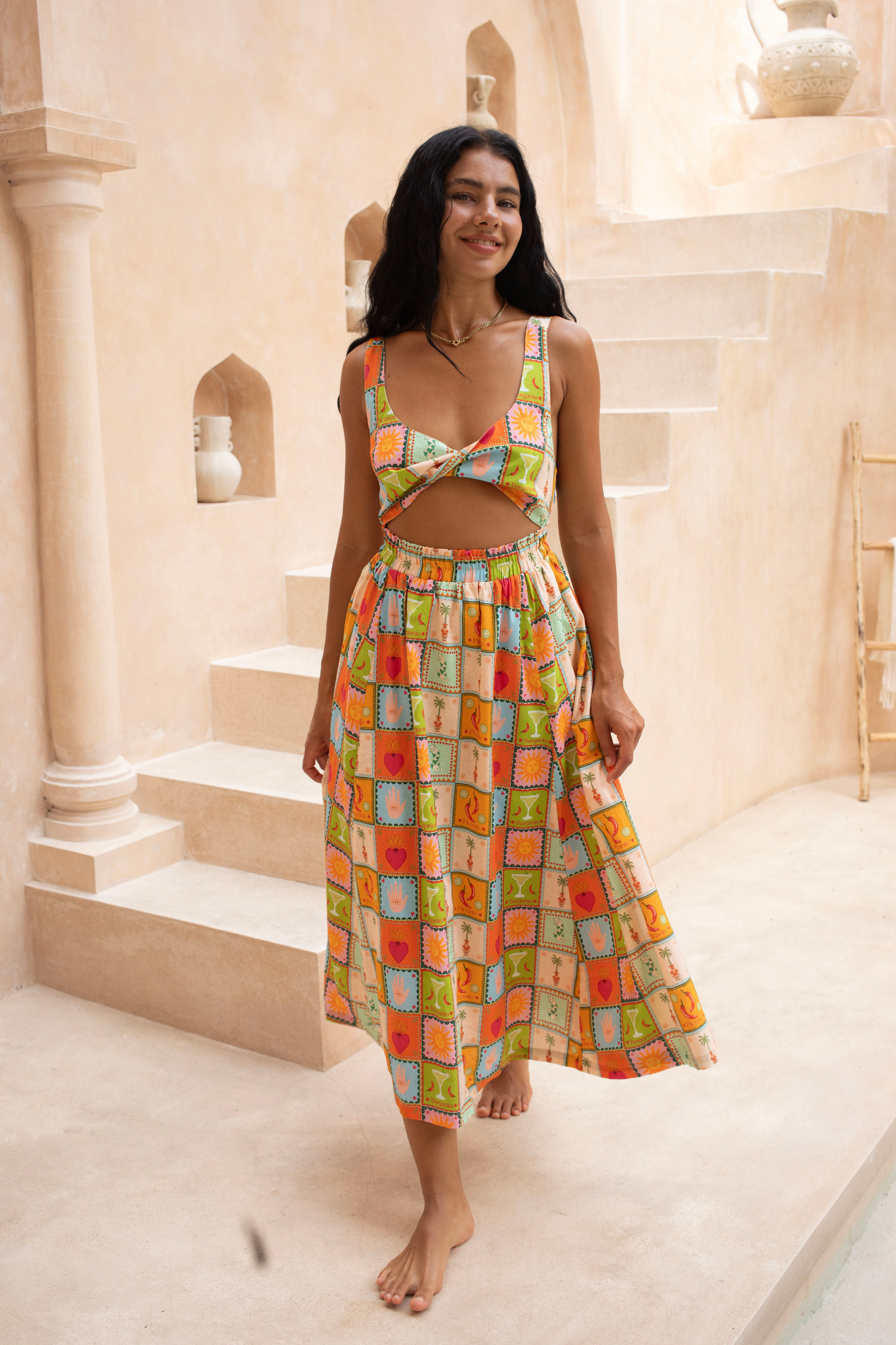 Turn up the heat in the Picante Twist Midi. With its bold Mexico-inspired print and flattering twist detail, this dress is fiery, flirty, and made to steal the spotlight at any event.