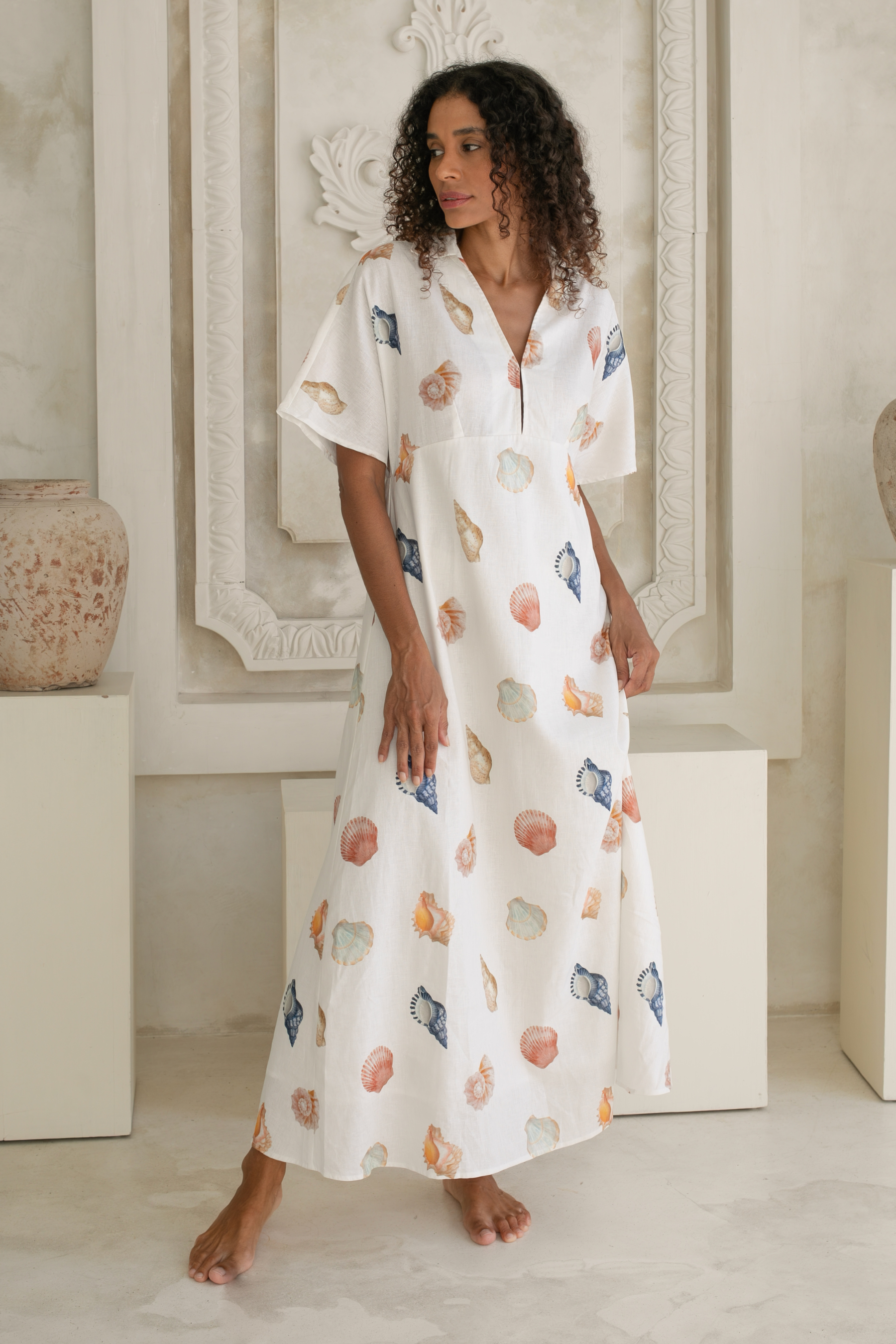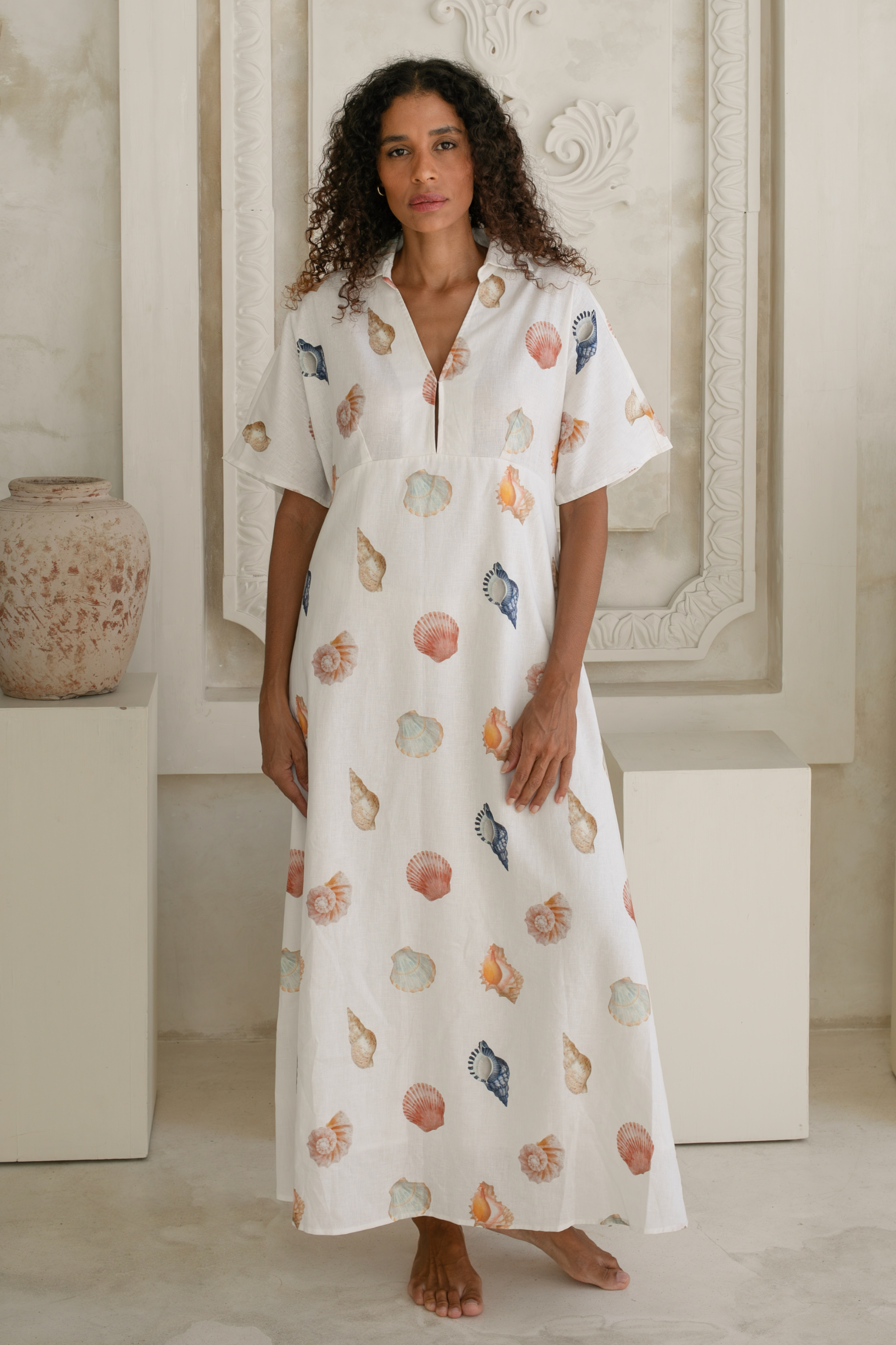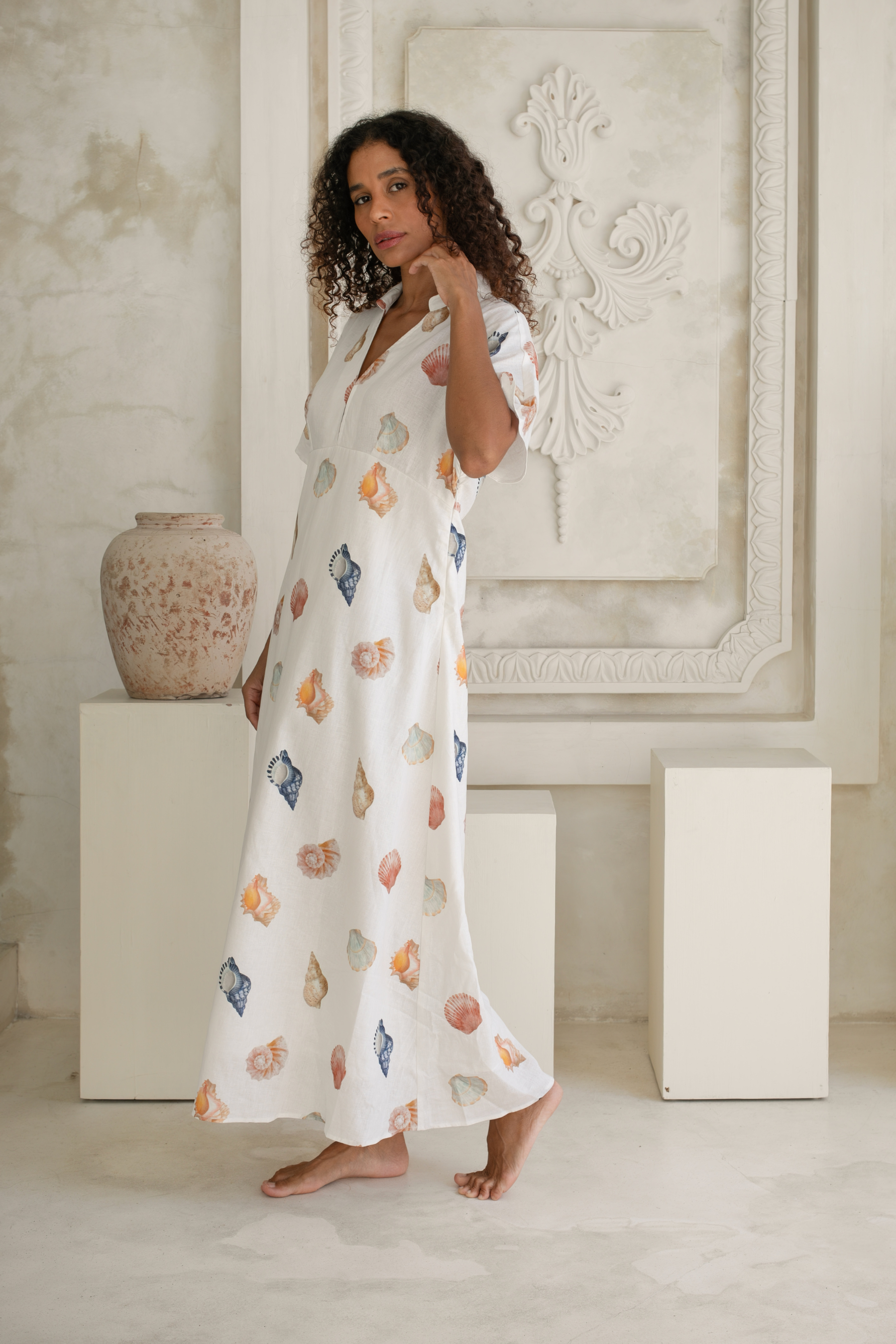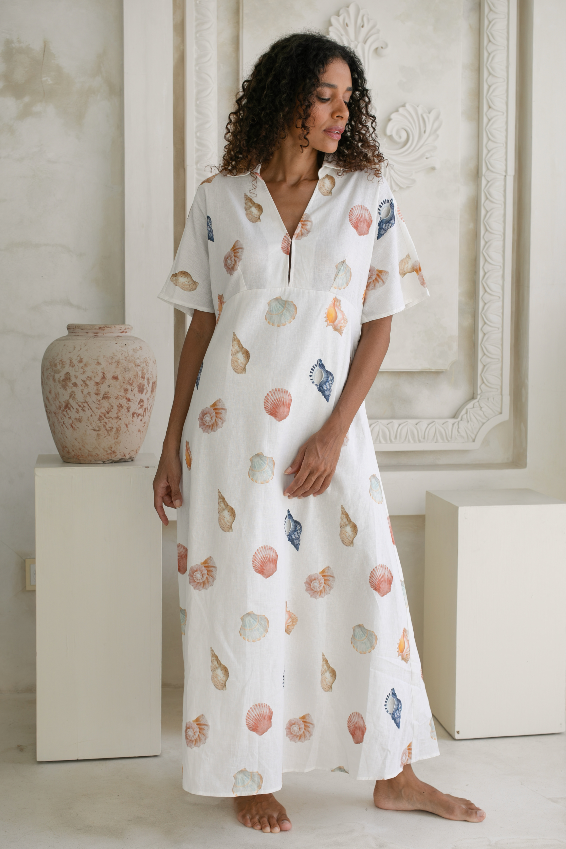 Introducing the Concha Midi Dress, a refined coastal beauty designed in our signature hand-drawn shell print. Crafted from a premium blend of 55% linen and 45% cotton, this dress offers lightweight structure, breathability and an elevated finish that makes it perfect for warm, sunlit days and balmy nights.