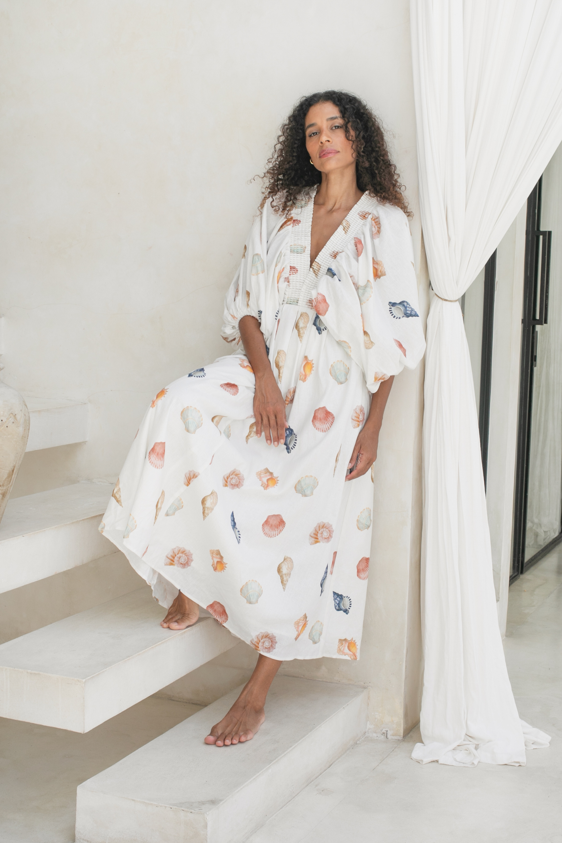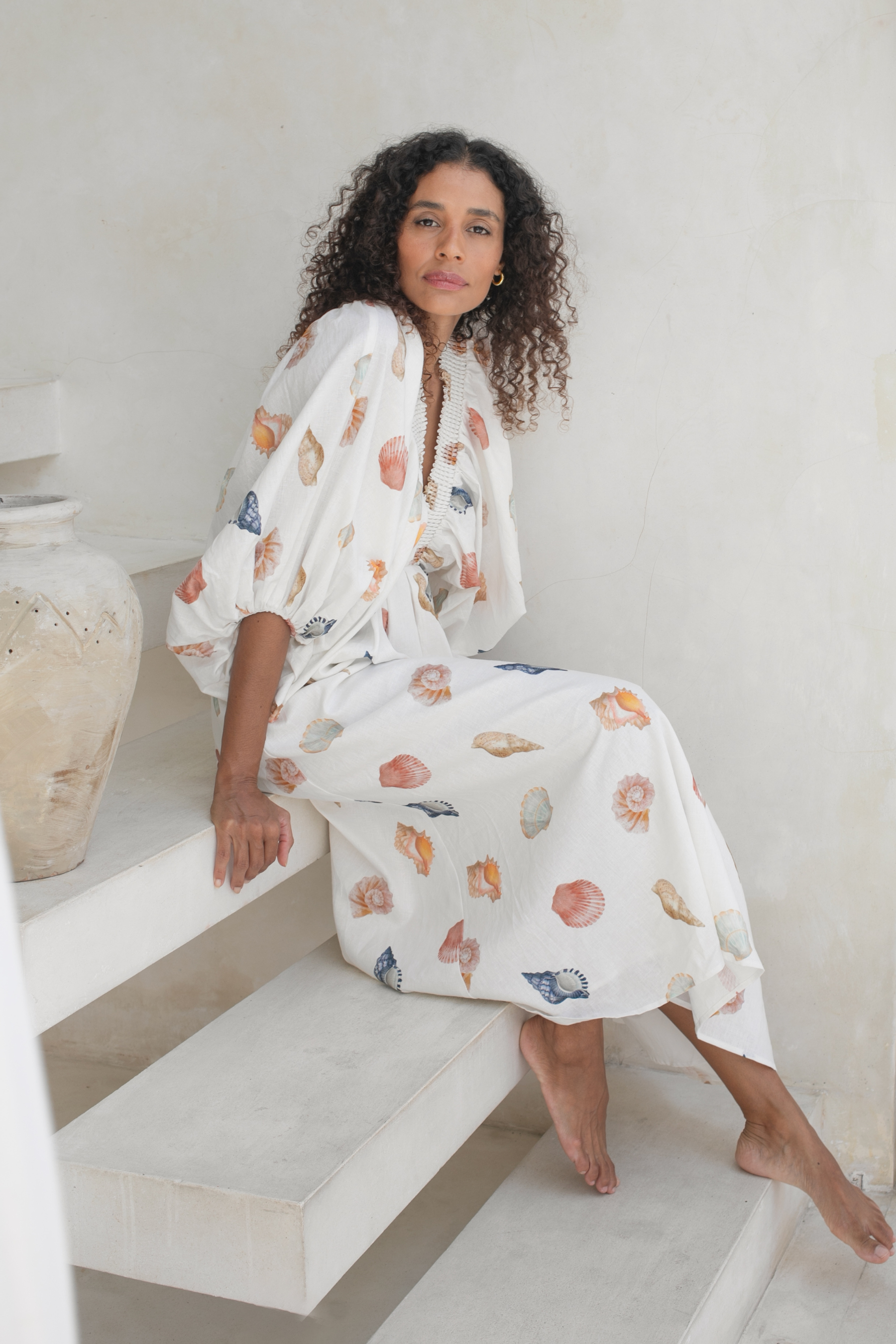 Crafted from our signature 55% linen and 45% cotton luxe blend, this mini offers the perfect balance of structure, breathability and soft movement. The exclusive hand-drawn Concha print features delicate seashell motifs, capturing the romance of Mediterranean coastlines and warm seaside escapes.