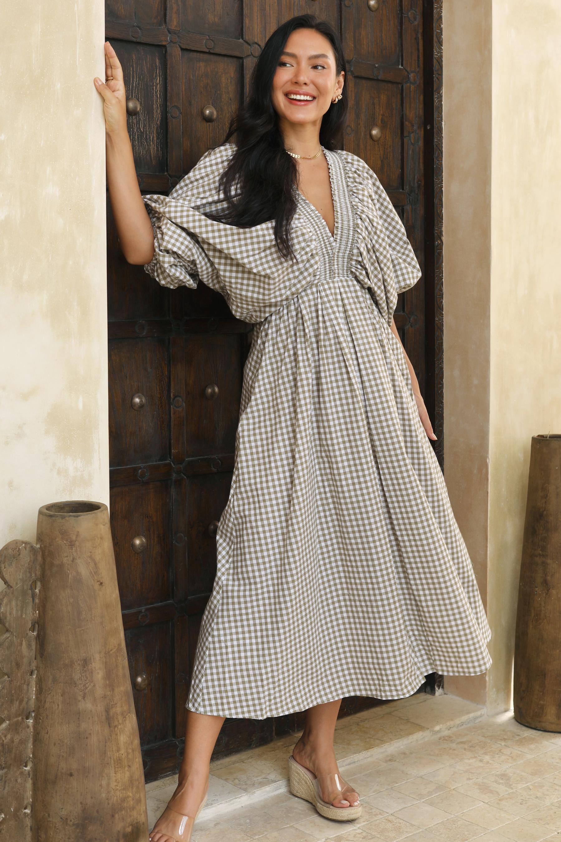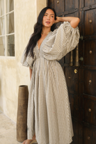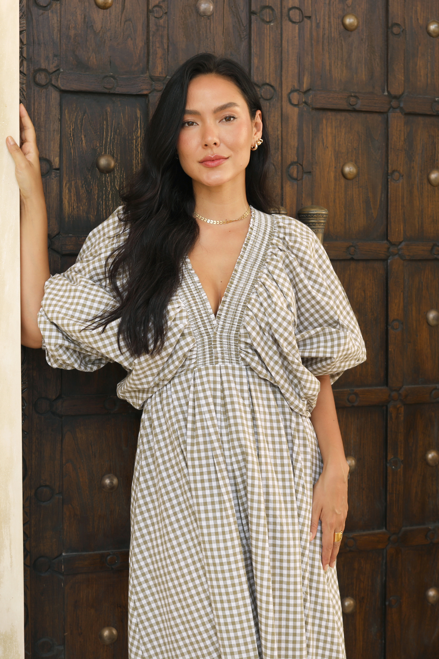 Crafted in an organic cotton timeless gingham print. It features playful balloon sleeves, a shirred neck detail, and a full, feminine skirt that moves with you.