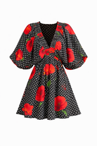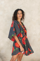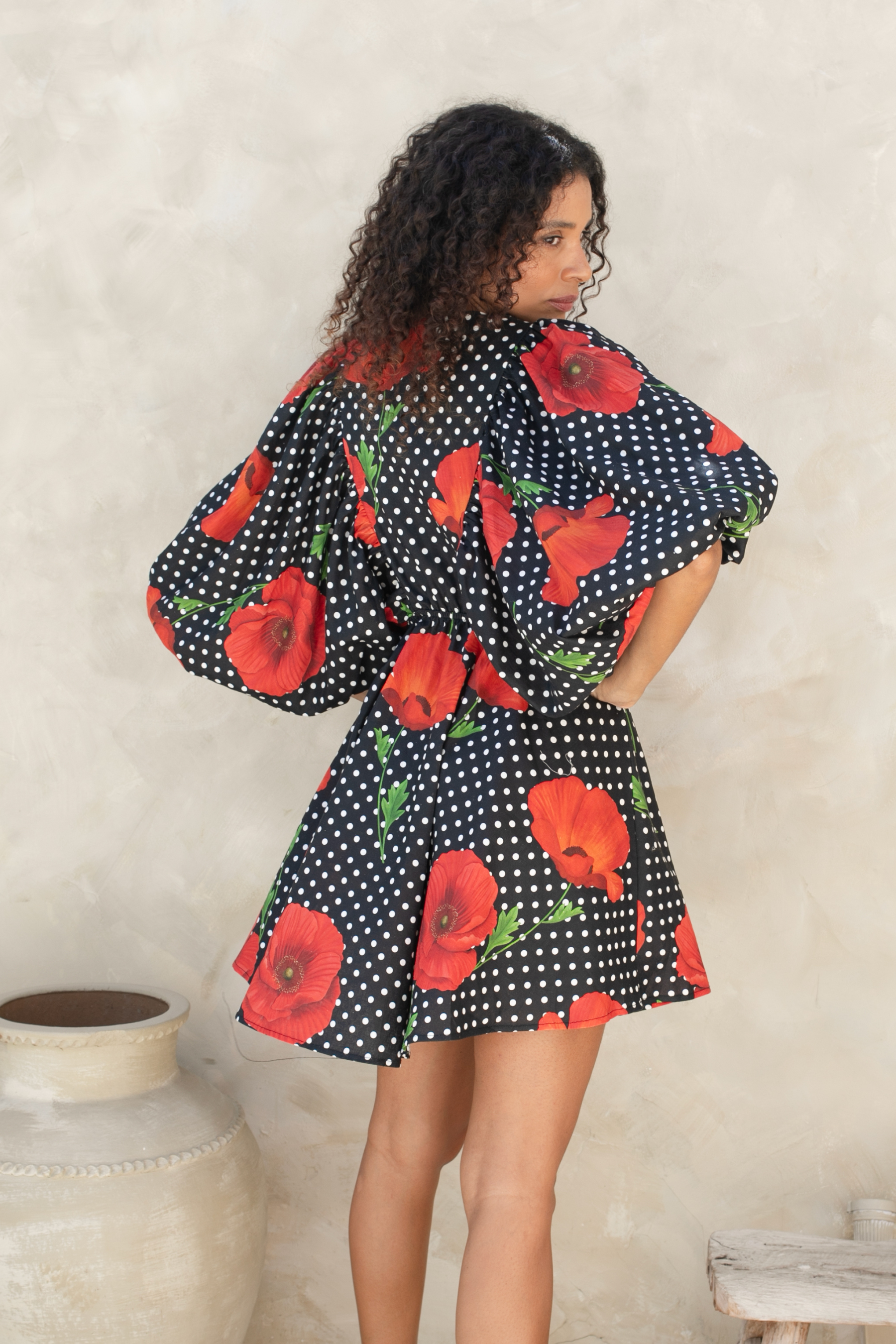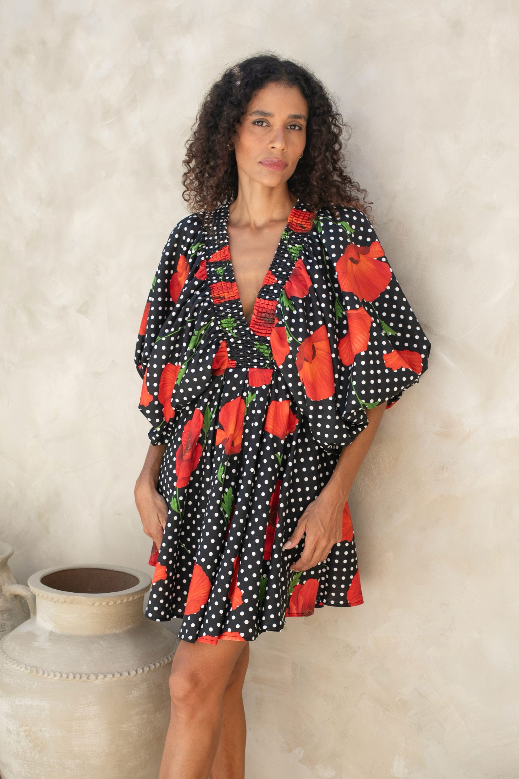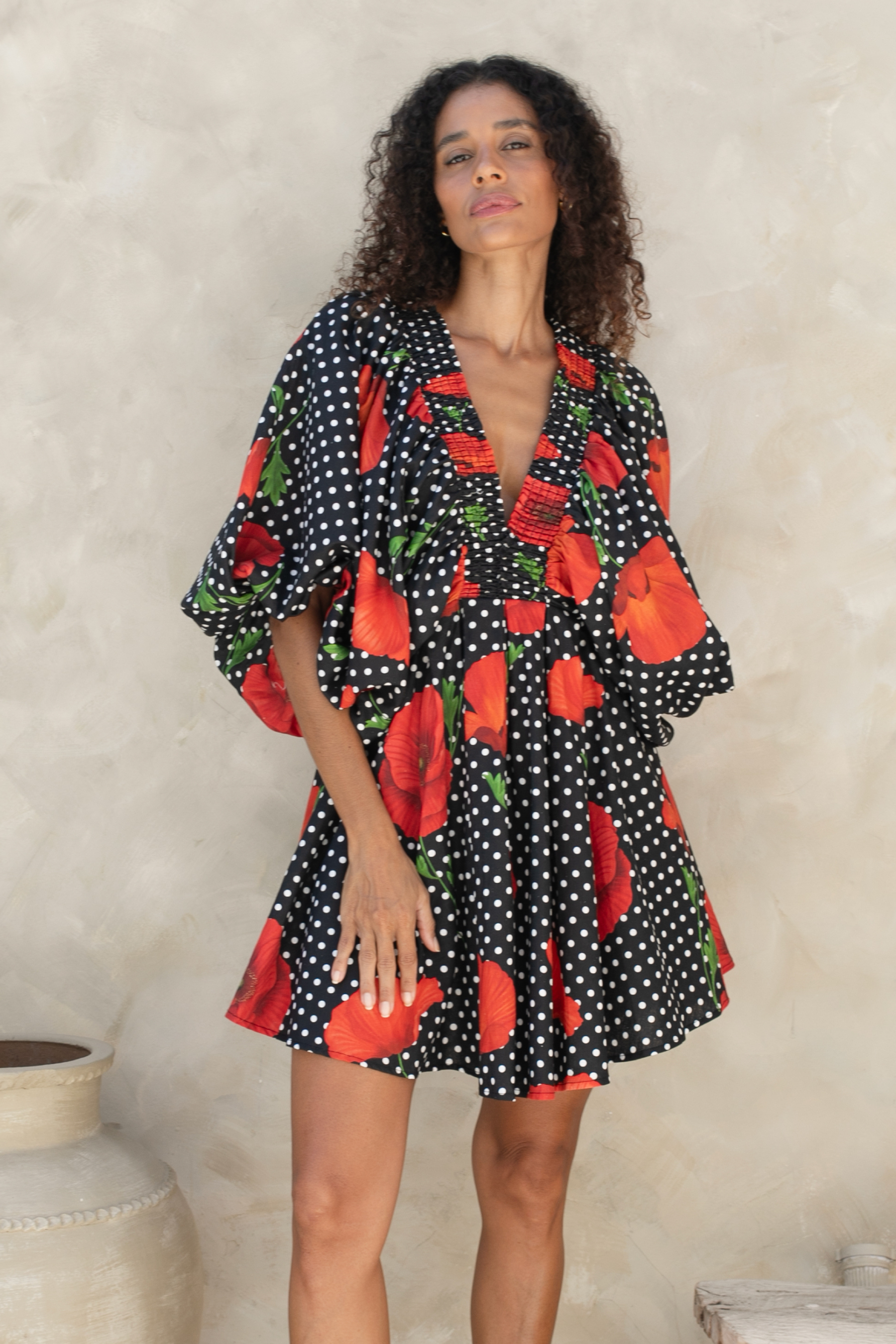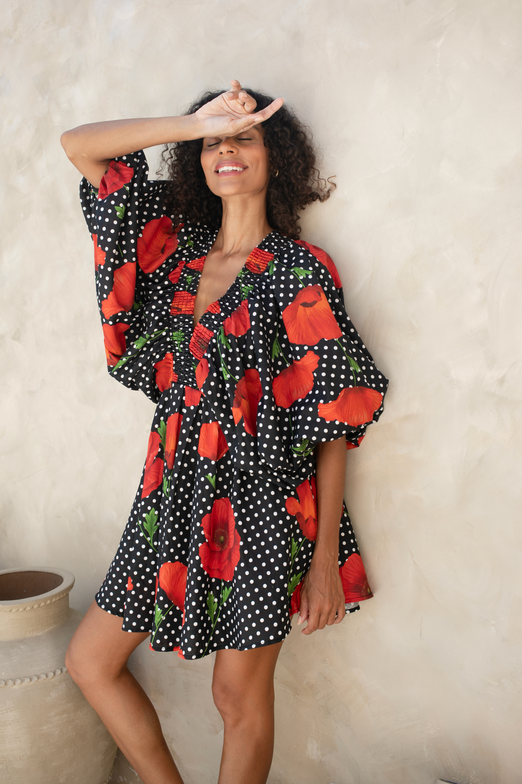 Introducing the Mimi Midnight Poppy Mini Dress, a striking new addition to our Luxe Collection.