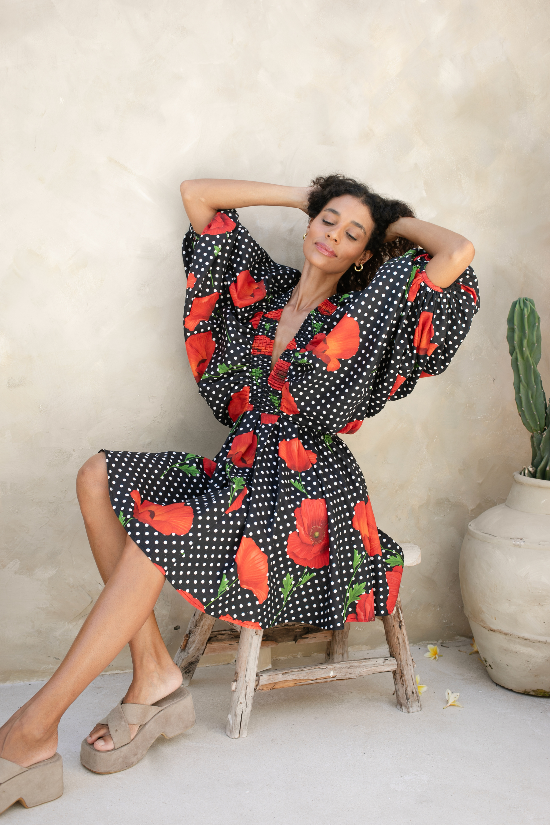 Crafted from a premium blend of 55% linen and 45% cotton, this dress offers a beautifully structured yet breathable feel—perfect for warm summer evenings and elevated daytime moments. The unique hand-drawn Midnight Poppy print transforms our signature Mimi silhouette into a true statement piece, blending bold red florals with delicate monochrome spotting for a touch of European drama.