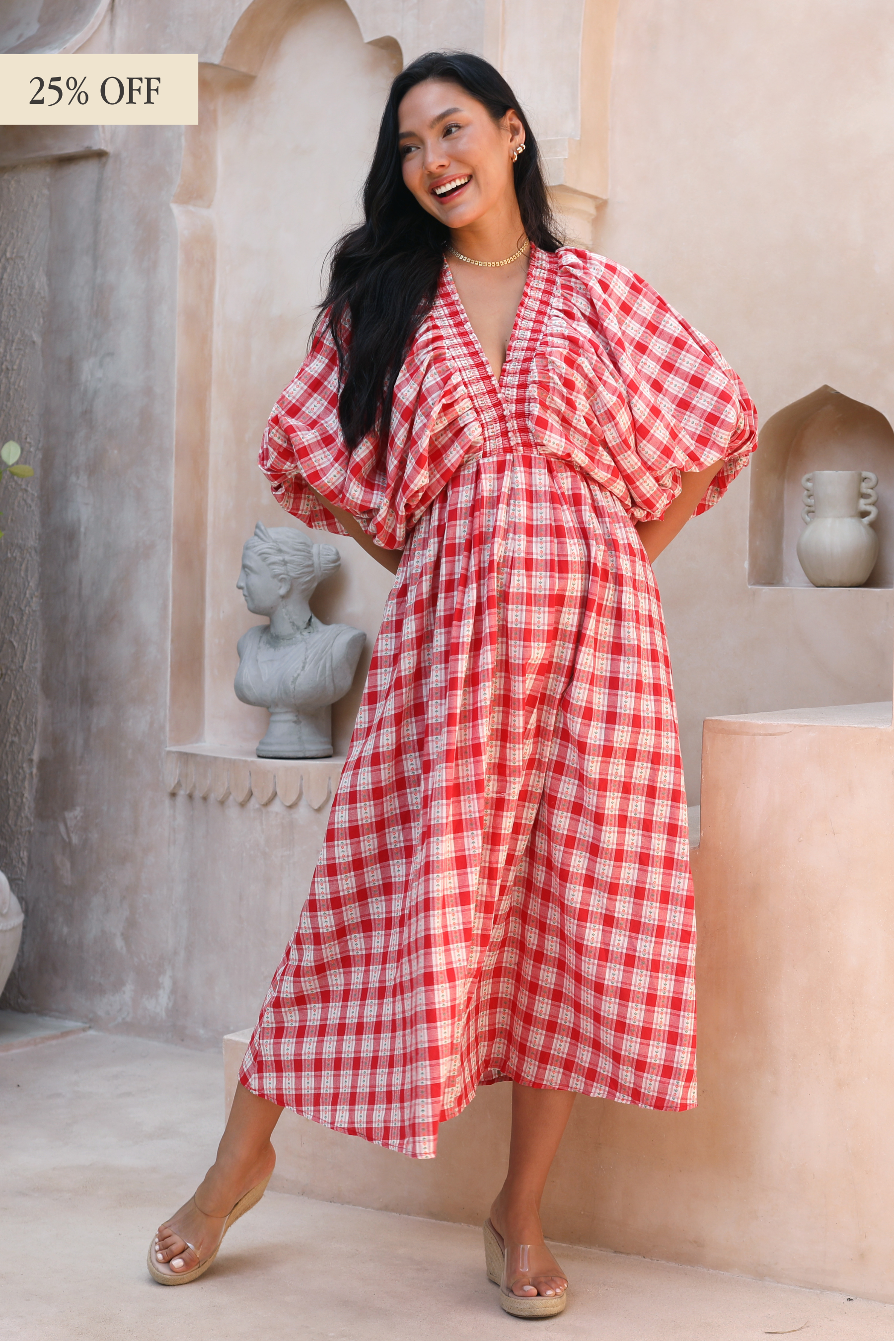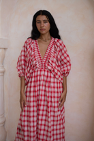 Crafted in an organic cotton timeless gingham print. It features playful balloon sleeves, a shirred neck detail, and a full, feminine skirt that moves with you.