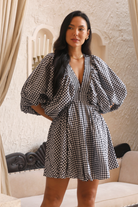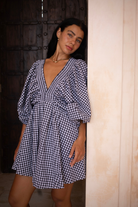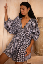 Crafted in an organic cotton timeless gingham print. It features playful balloon sleeves, a shirred neck detail, and a full, feminine skirt that moves with you.
