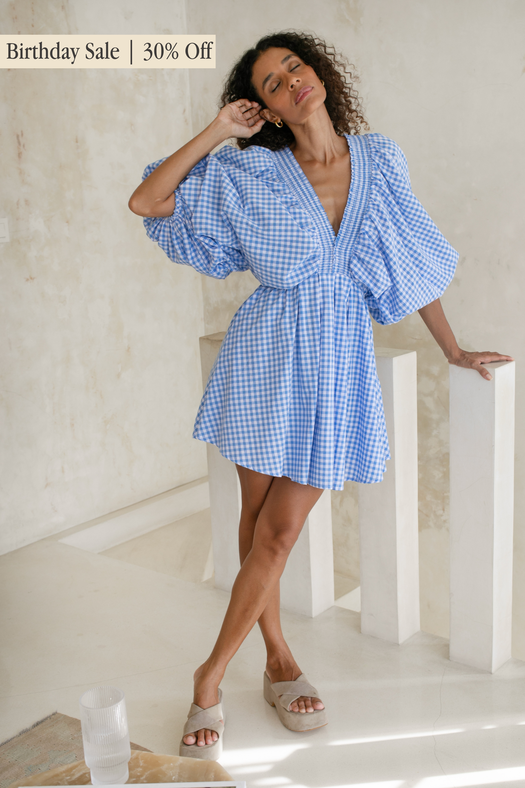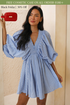 Crafted in an organic cotton timeless gingham print. It features playful balloon sleeves, a shirred neck detail, and a full, feminine skirt that moves with you.