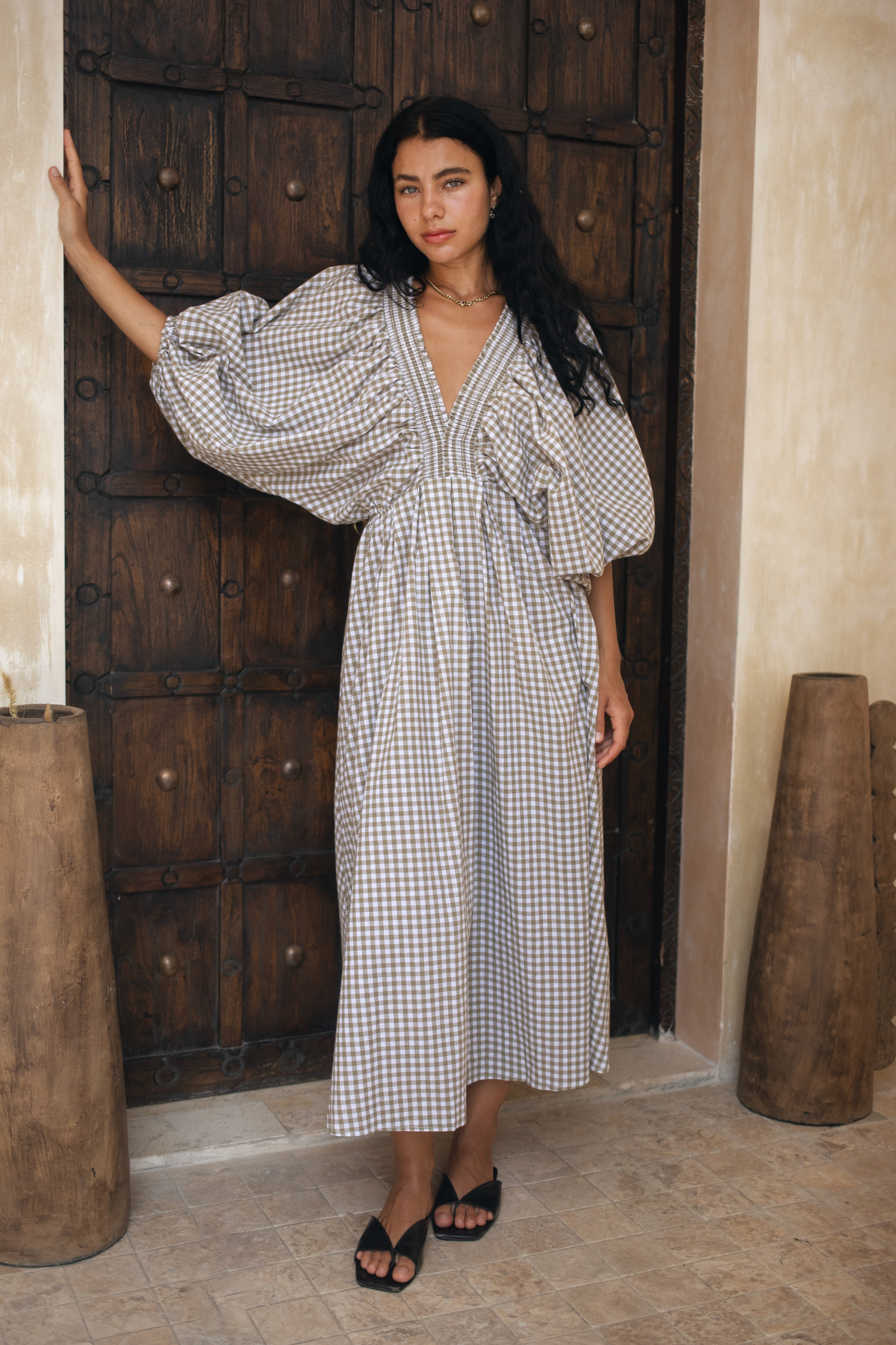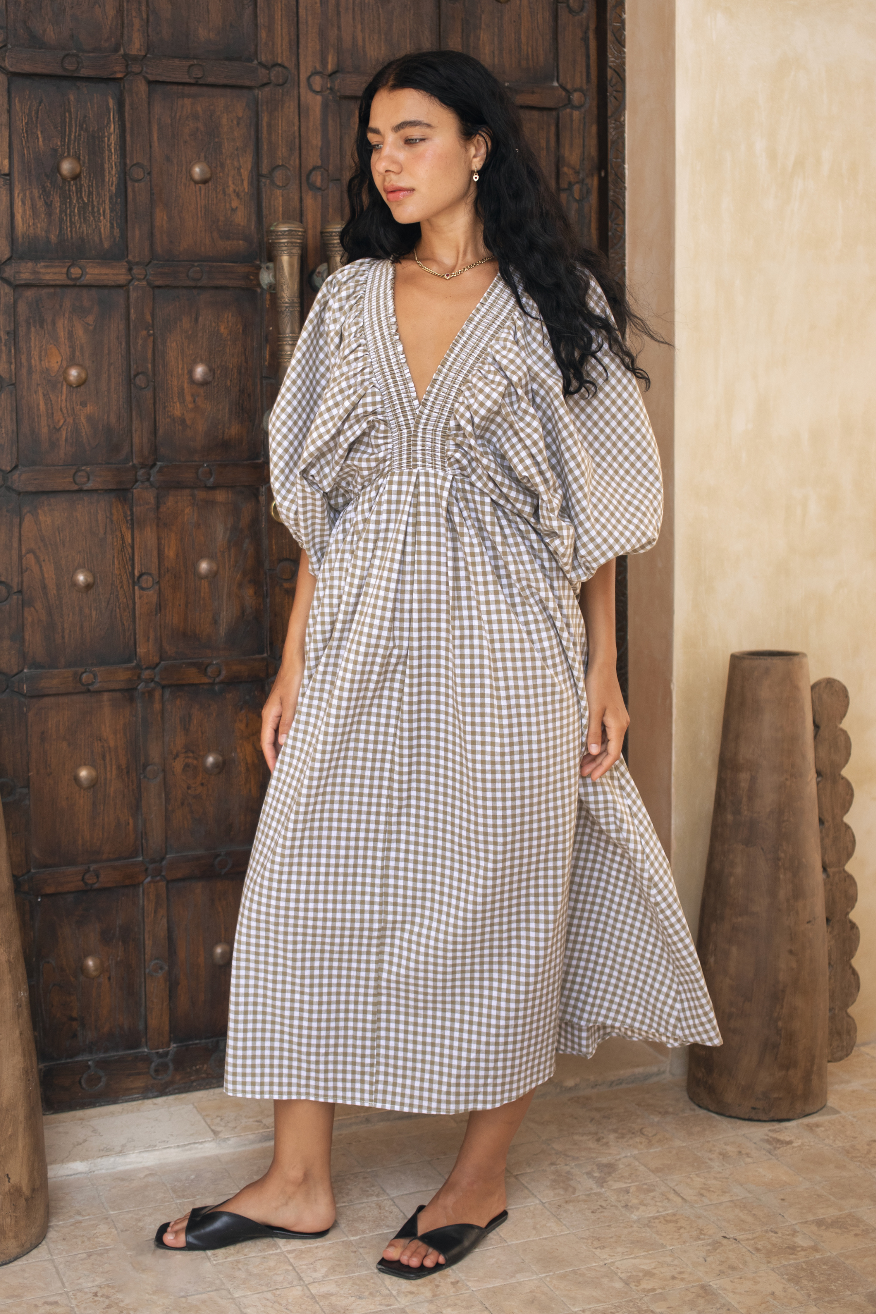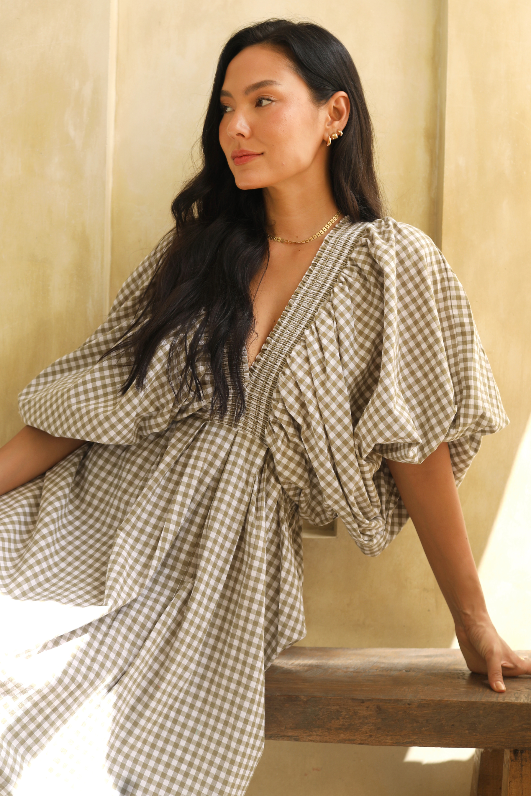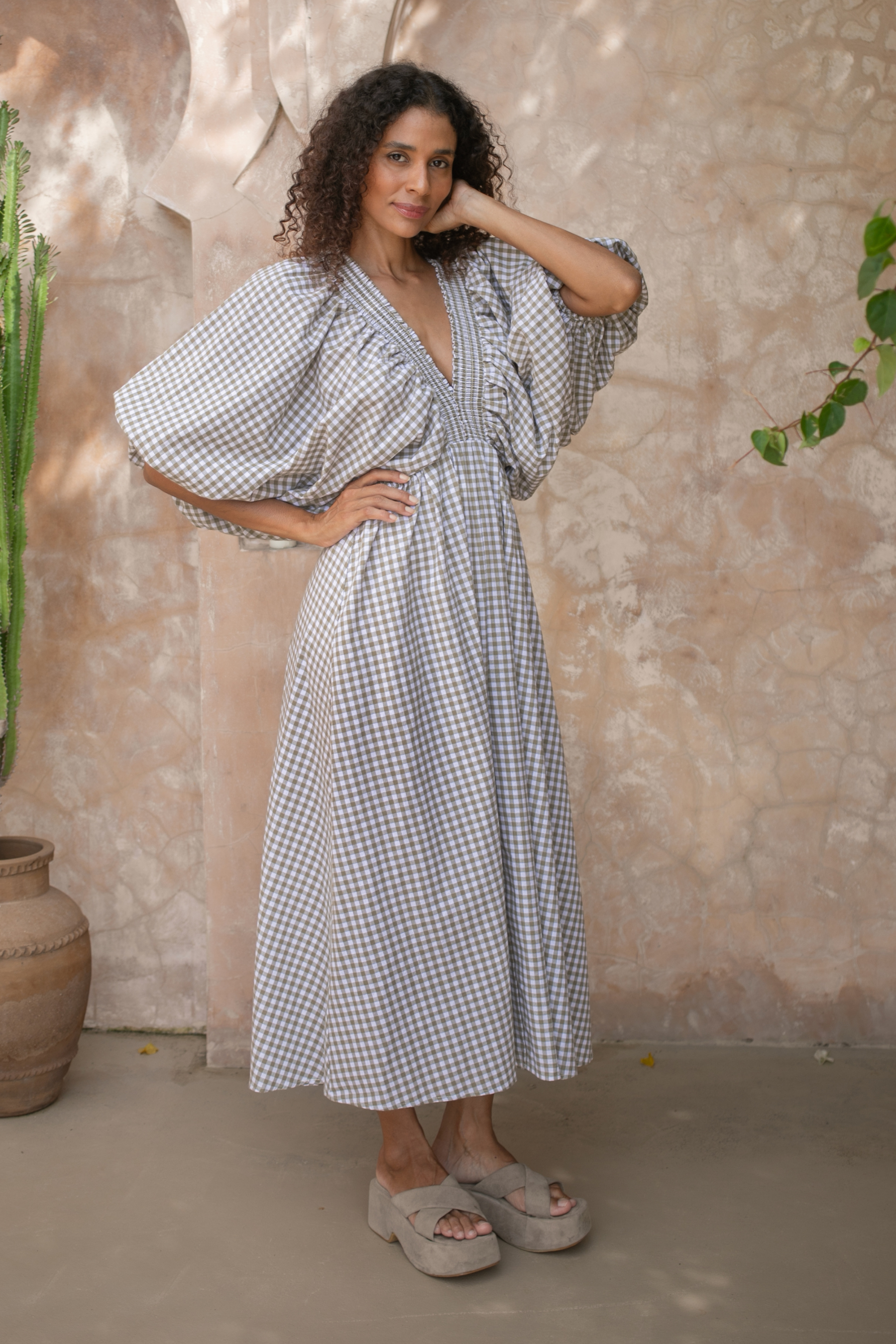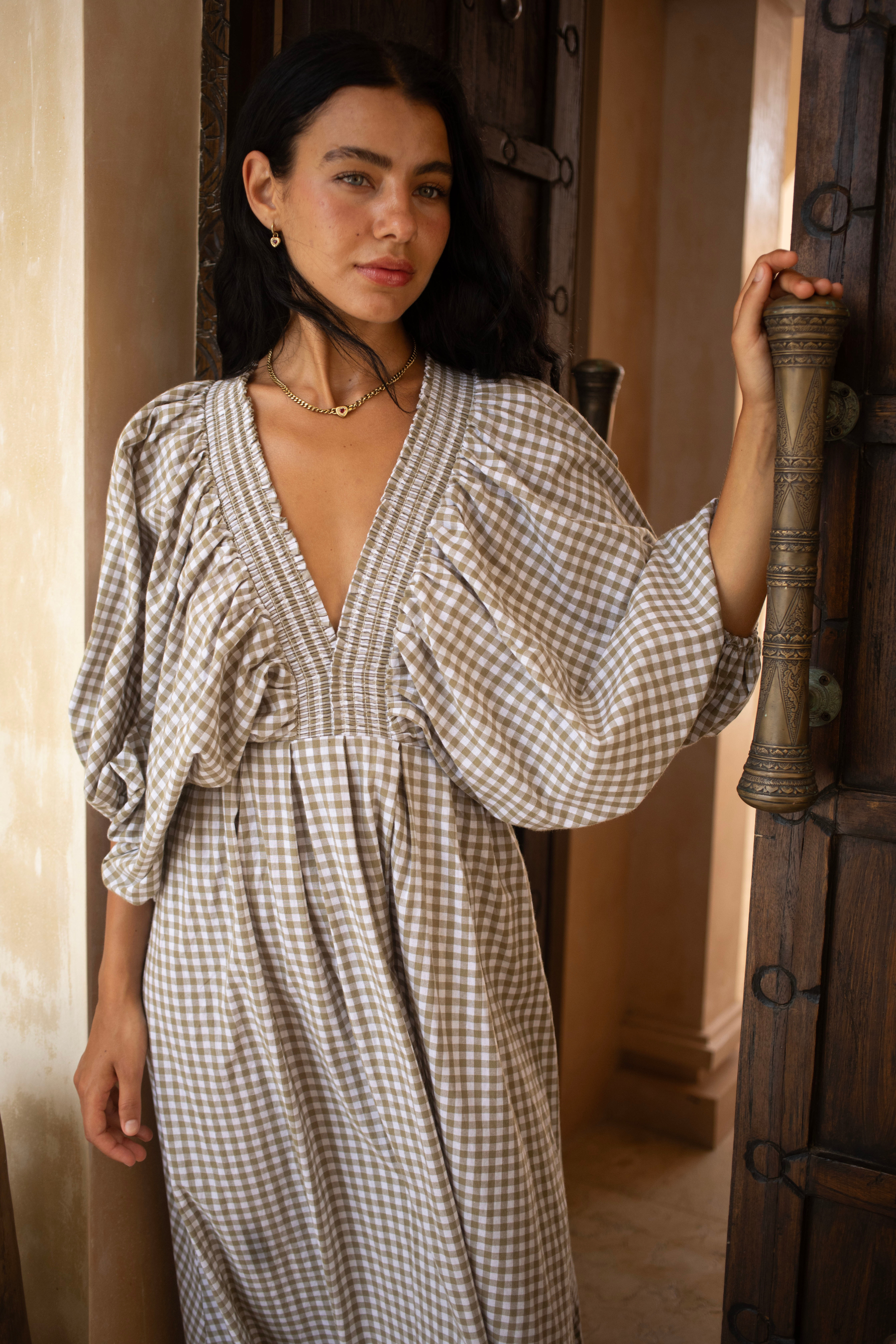 Crafted in an organic cotton timeless gingham print. It features playful balloon sleeves, a shirred neck detail, and a full, feminine skirt that moves with you.