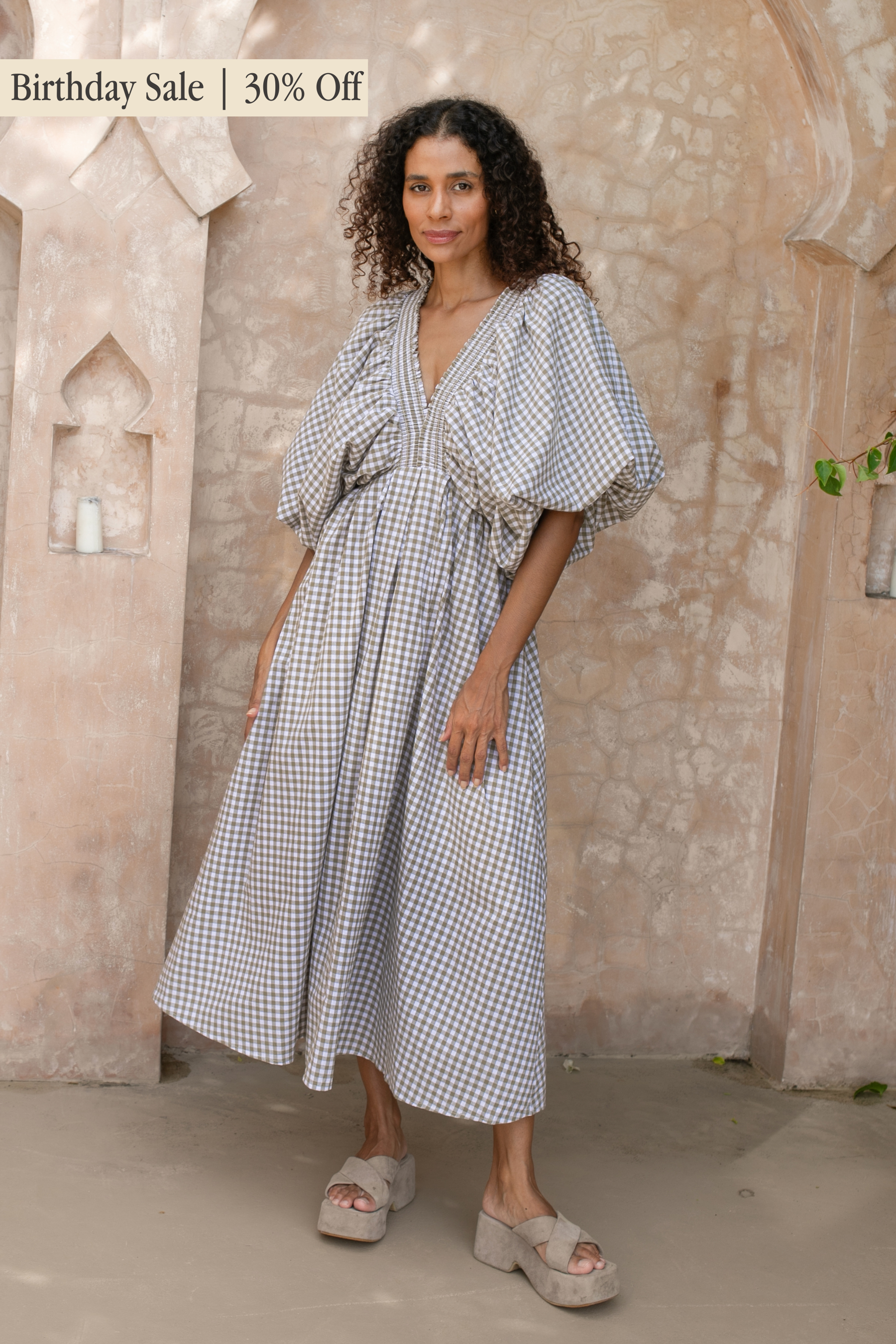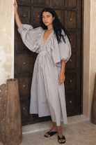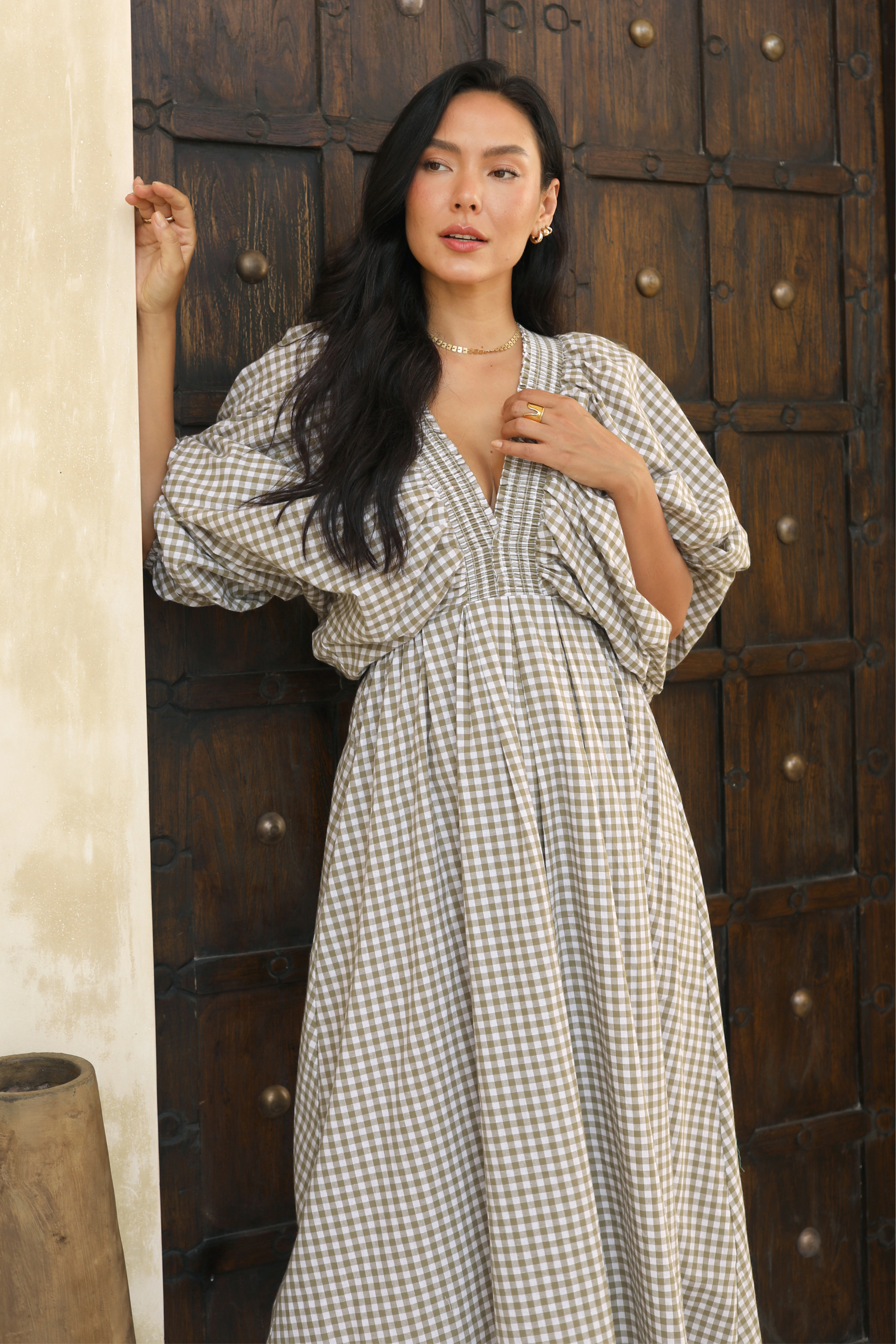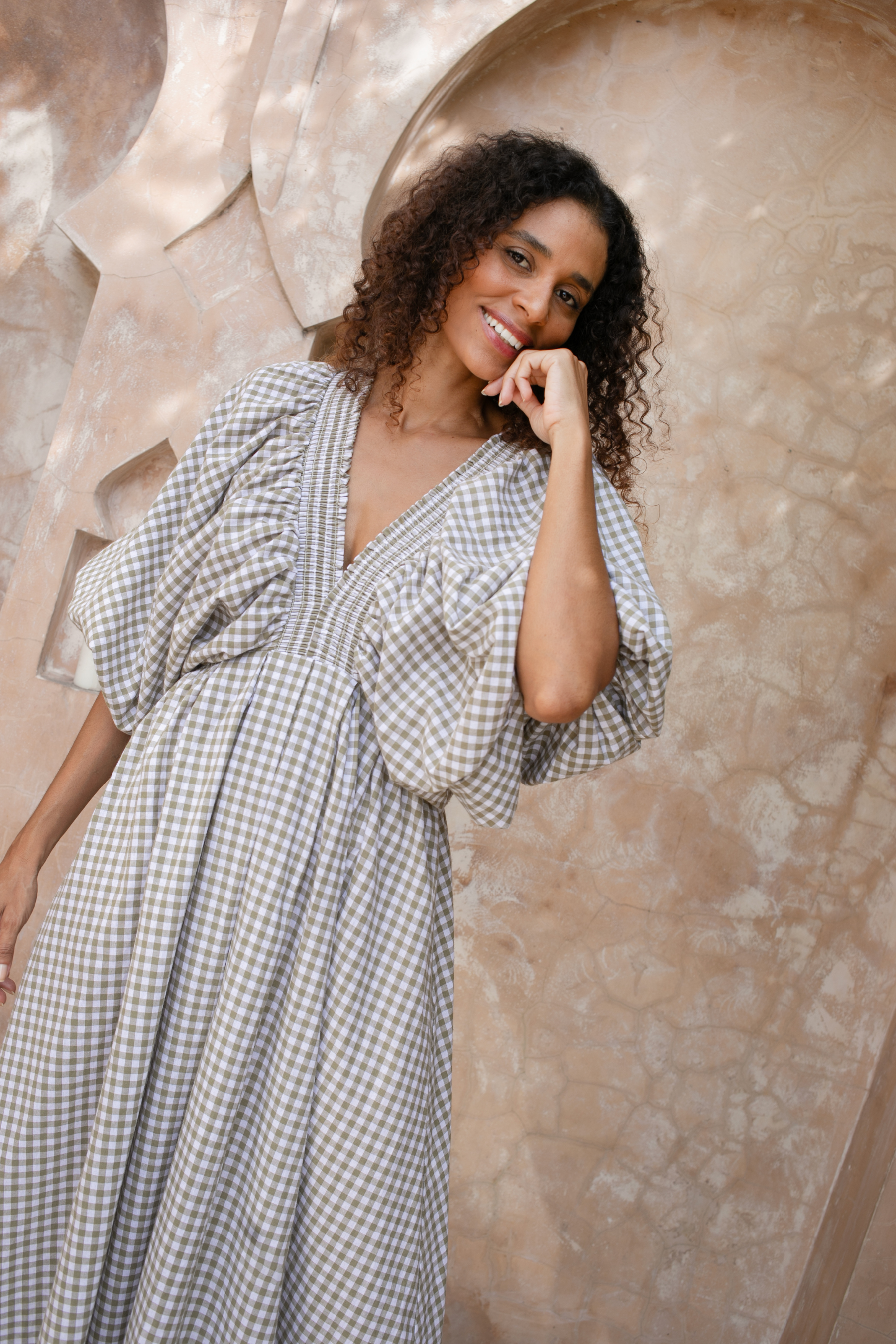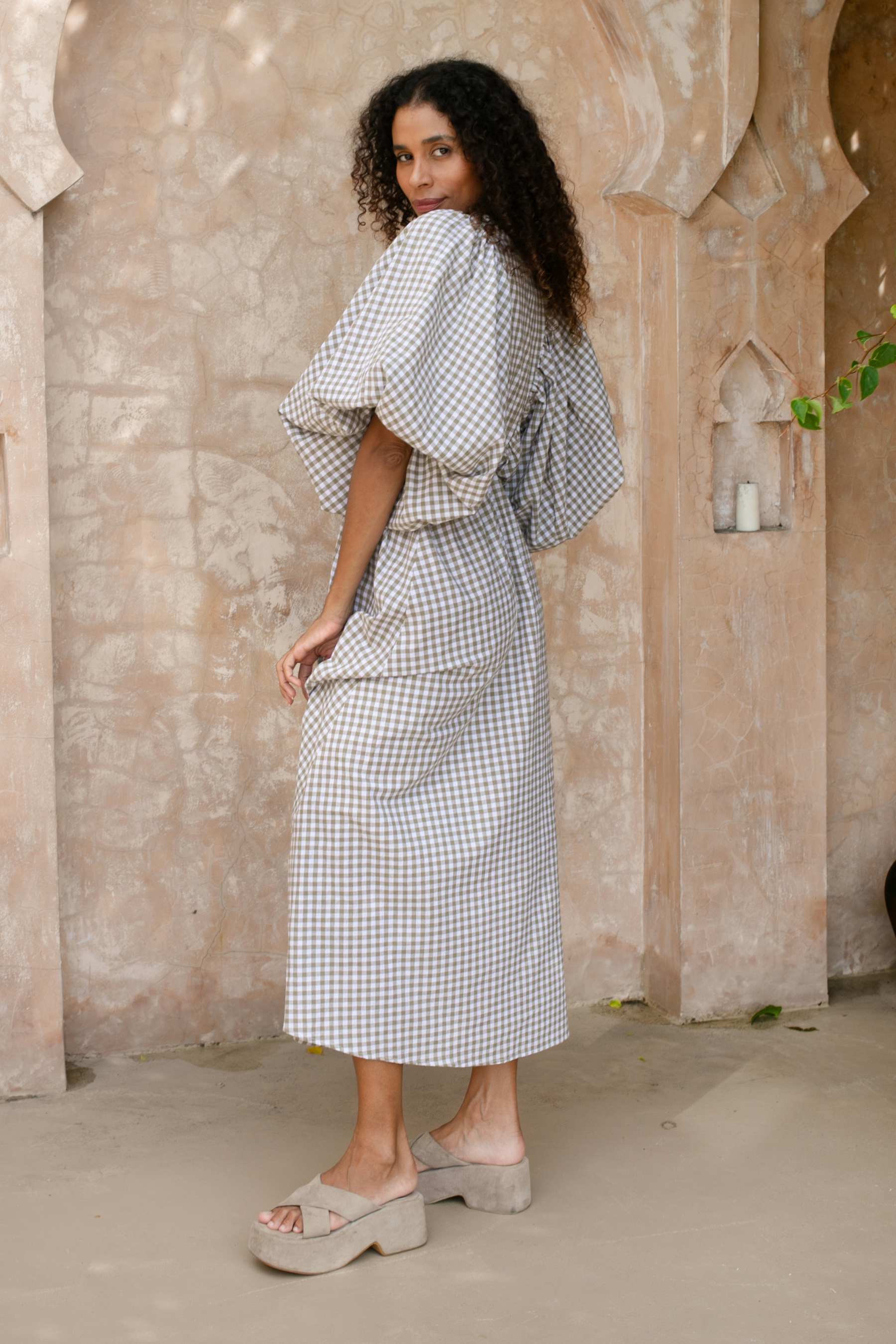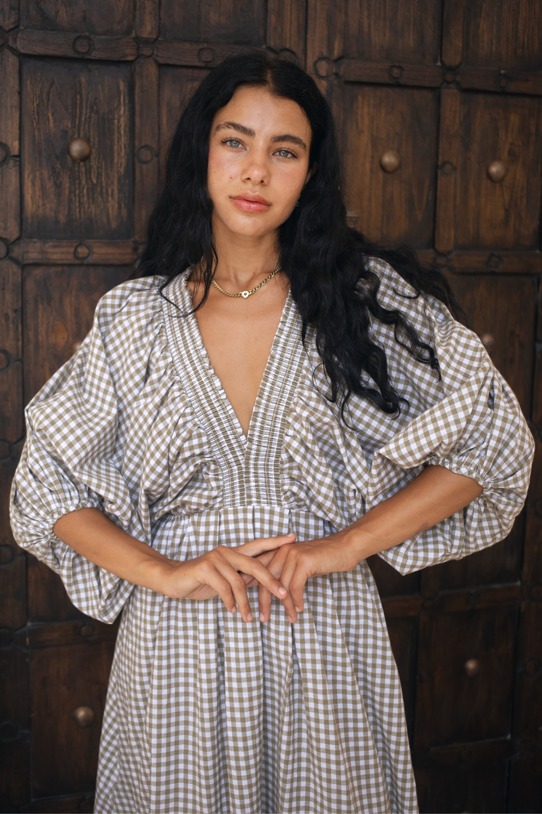 Crafted in an organic cotton timeless gingham print. It features playful balloon sleeves, a shirred neck detail, and a full, feminine skirt that moves with you.