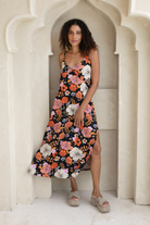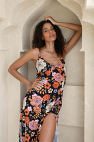 We are absolutely swooning over this Gardenia Black Midi Dress featuring our signature floral motif. A simple slip style in a bias cut, this midi perfectly skims the body.