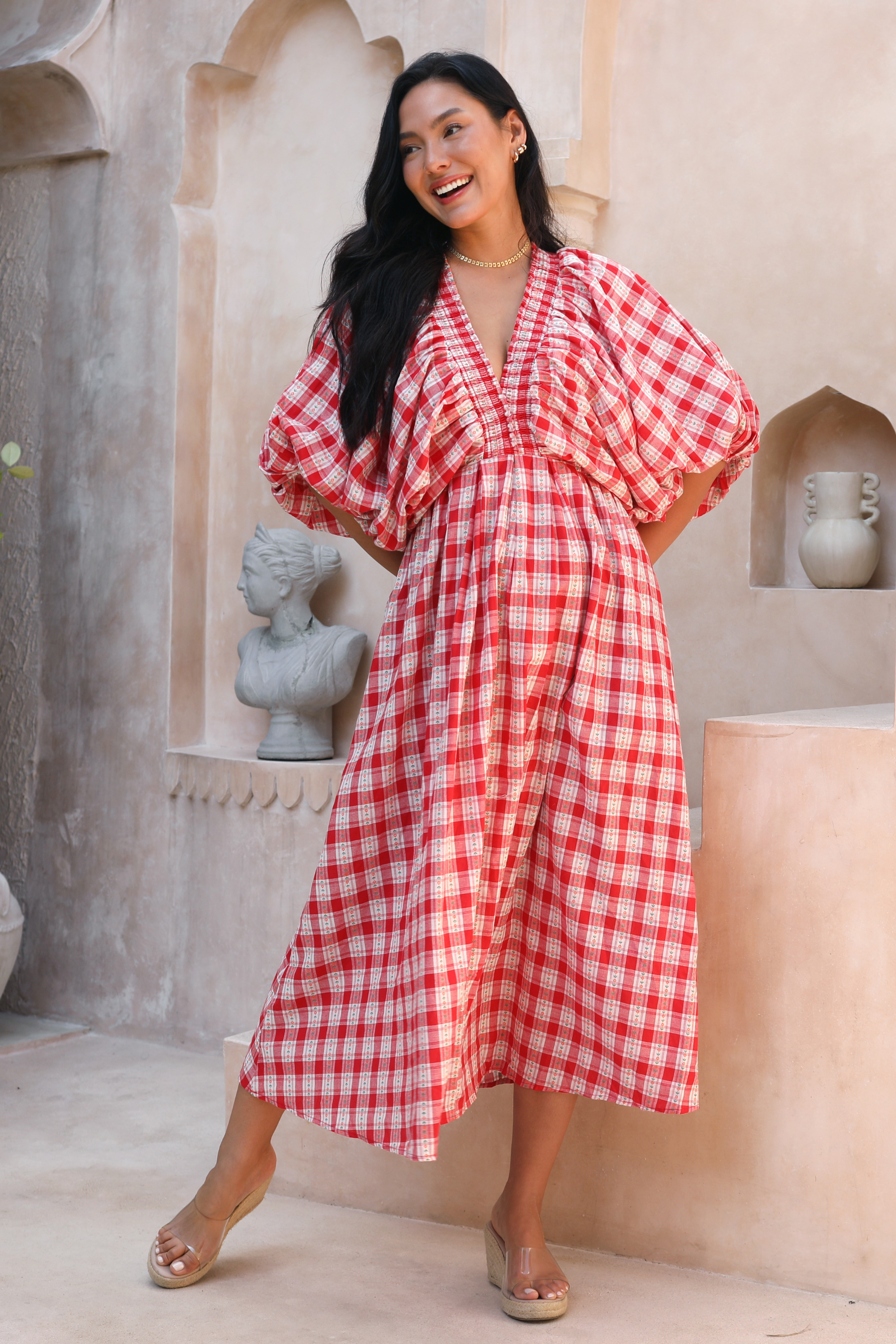 Crafted in an organic cotton timeless gingham print. It features playful balloon sleeves, a shirred neck detail, and a full, feminine skirt that moves with you.