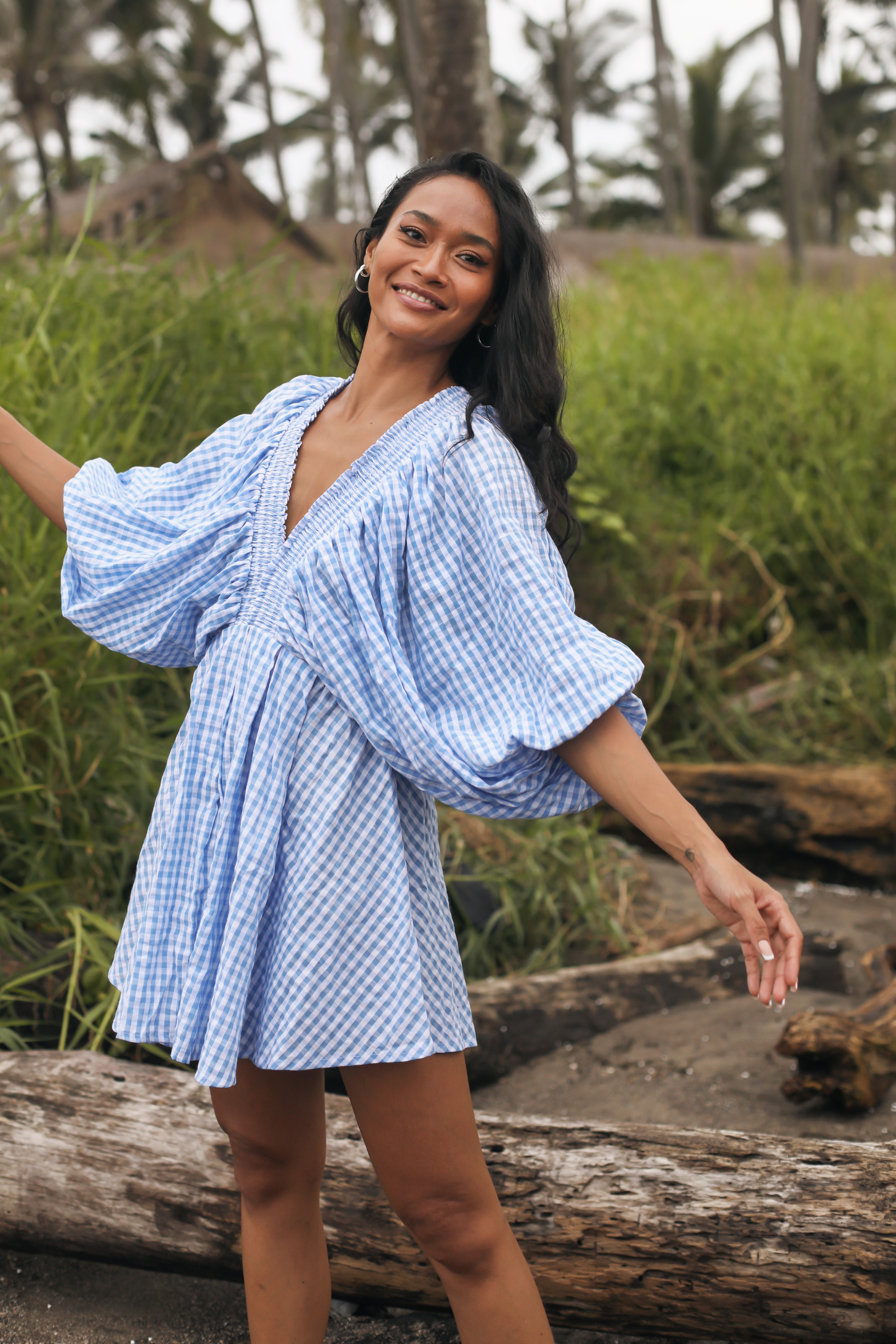Crafted in an organic cotton timeless gingham print. It features playful balloon sleeves, a shirred neck detail, and a full, feminine skirt that moves with you.