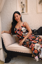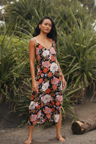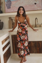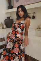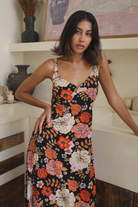 We are absolutely swooning over this Gardenia Black Midi Dress featuring our signature floral motif. A simple slip style in a bias cut, this midi perfectly skims the body.