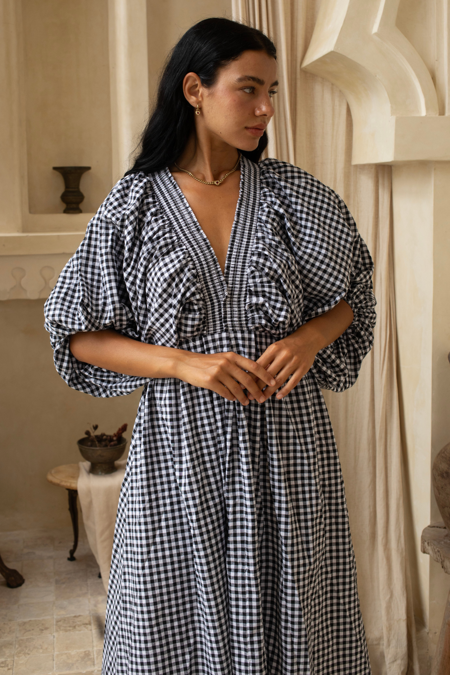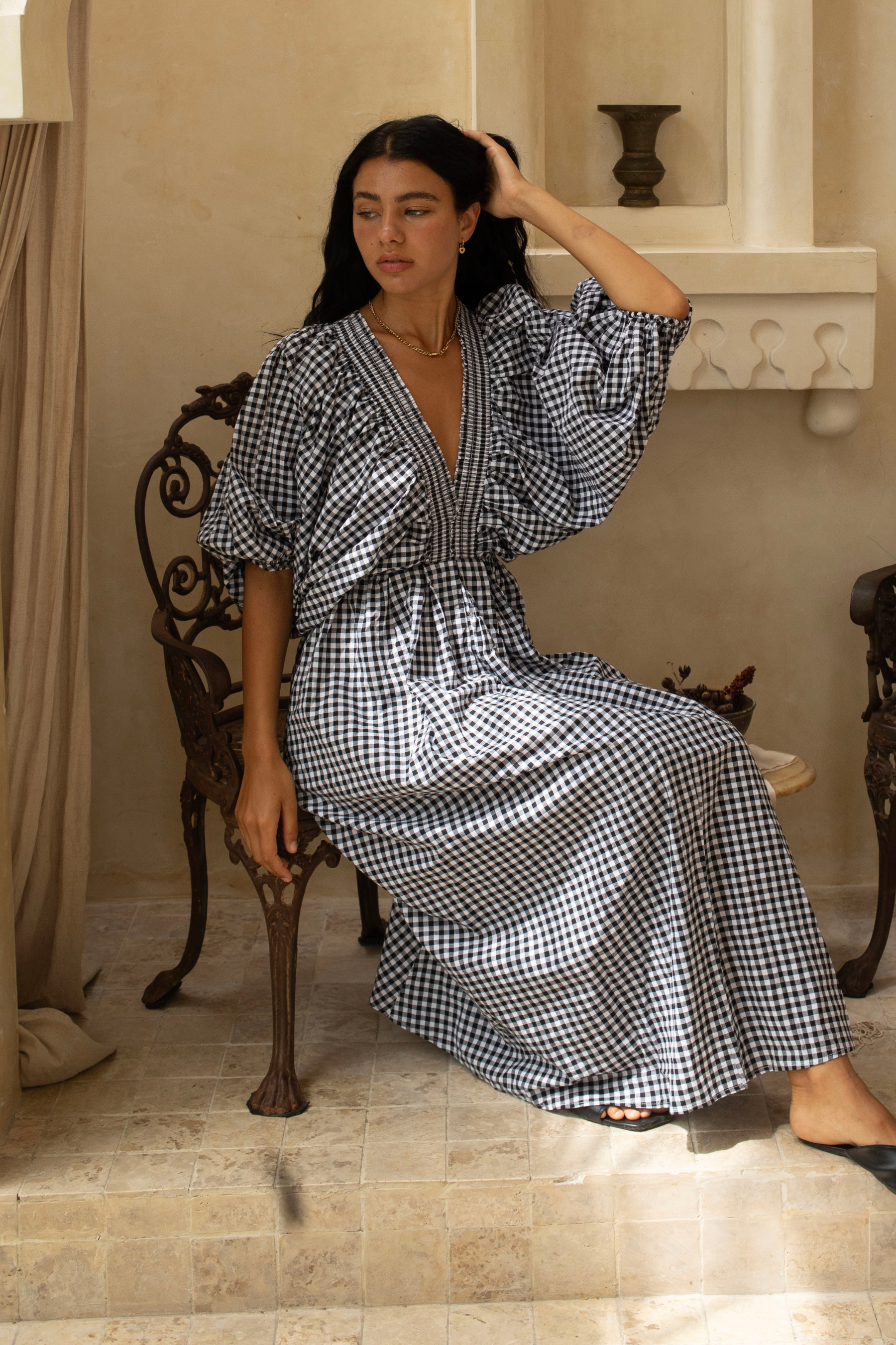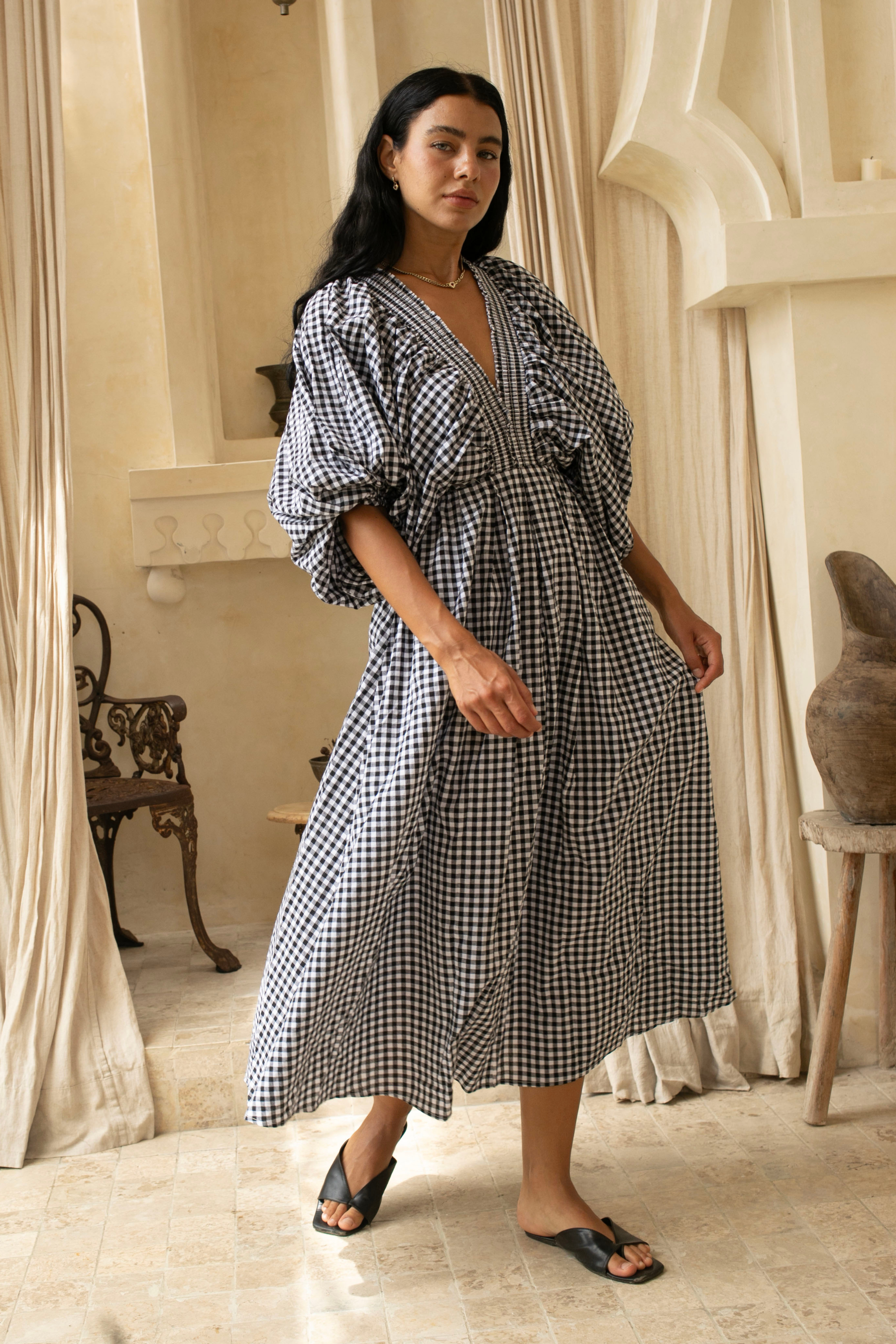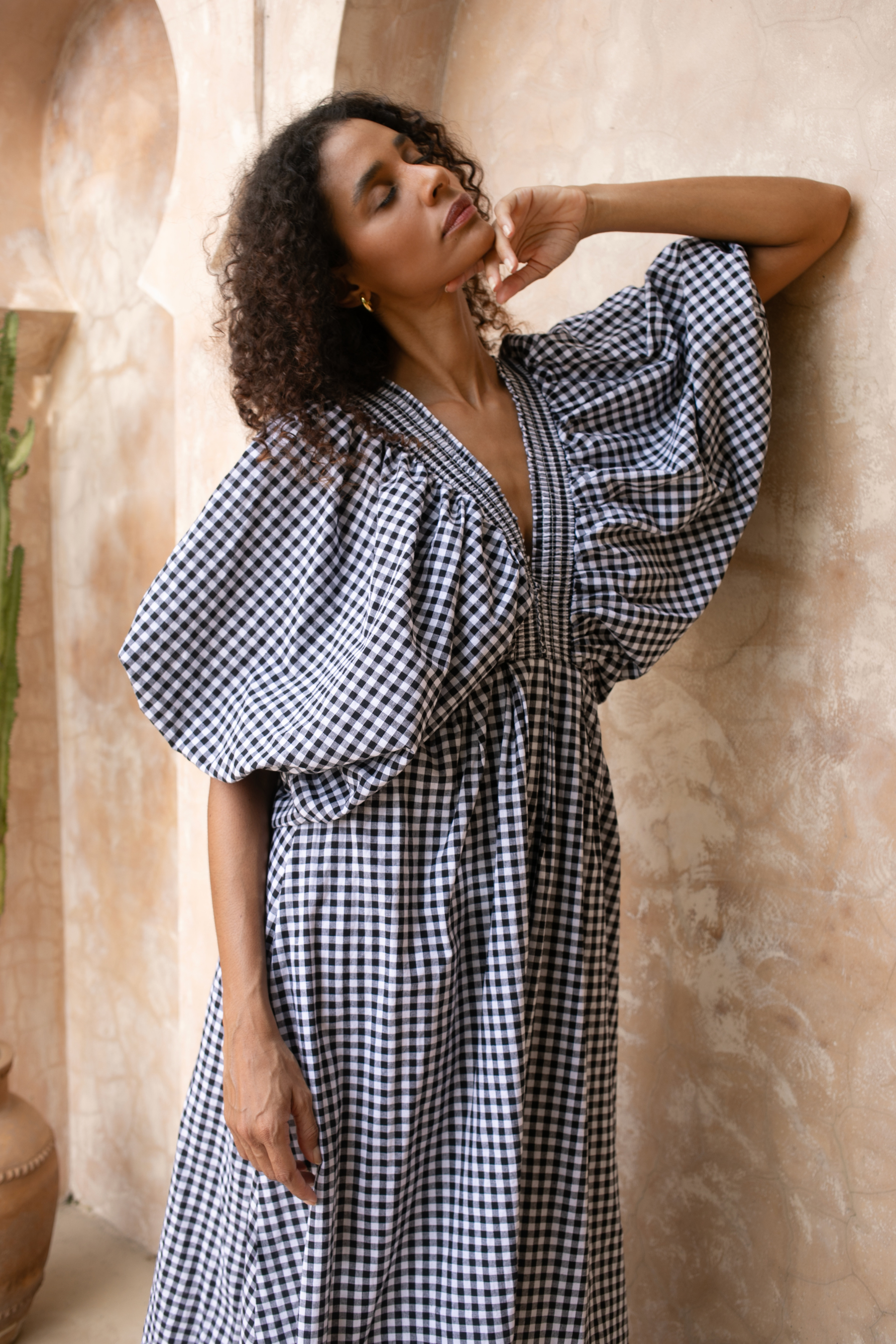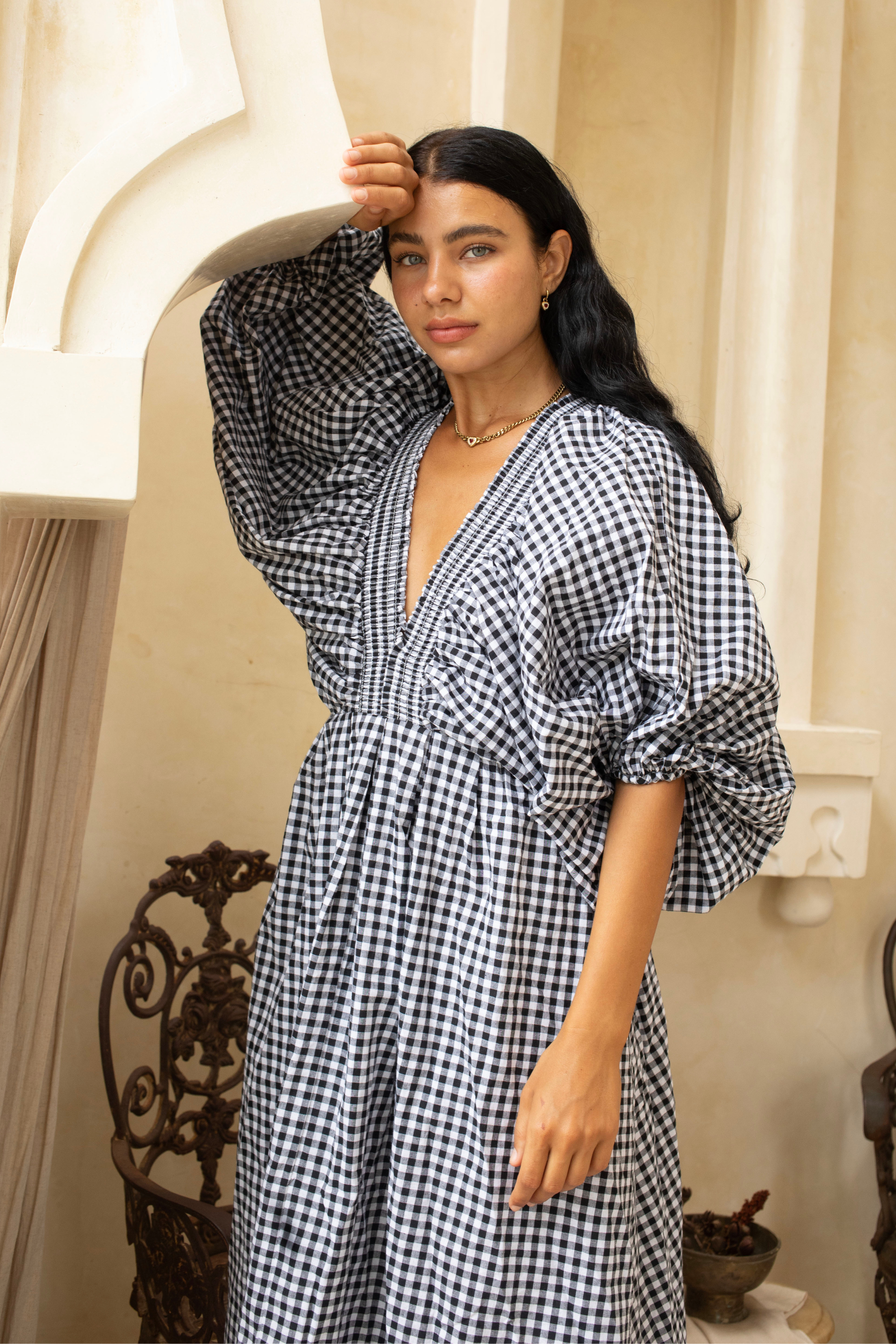 Crafted in an organic cotton timeless gingham print. It features playful balloon sleeves, a shirred neck detail, and a full, feminine skirt that moves with you.