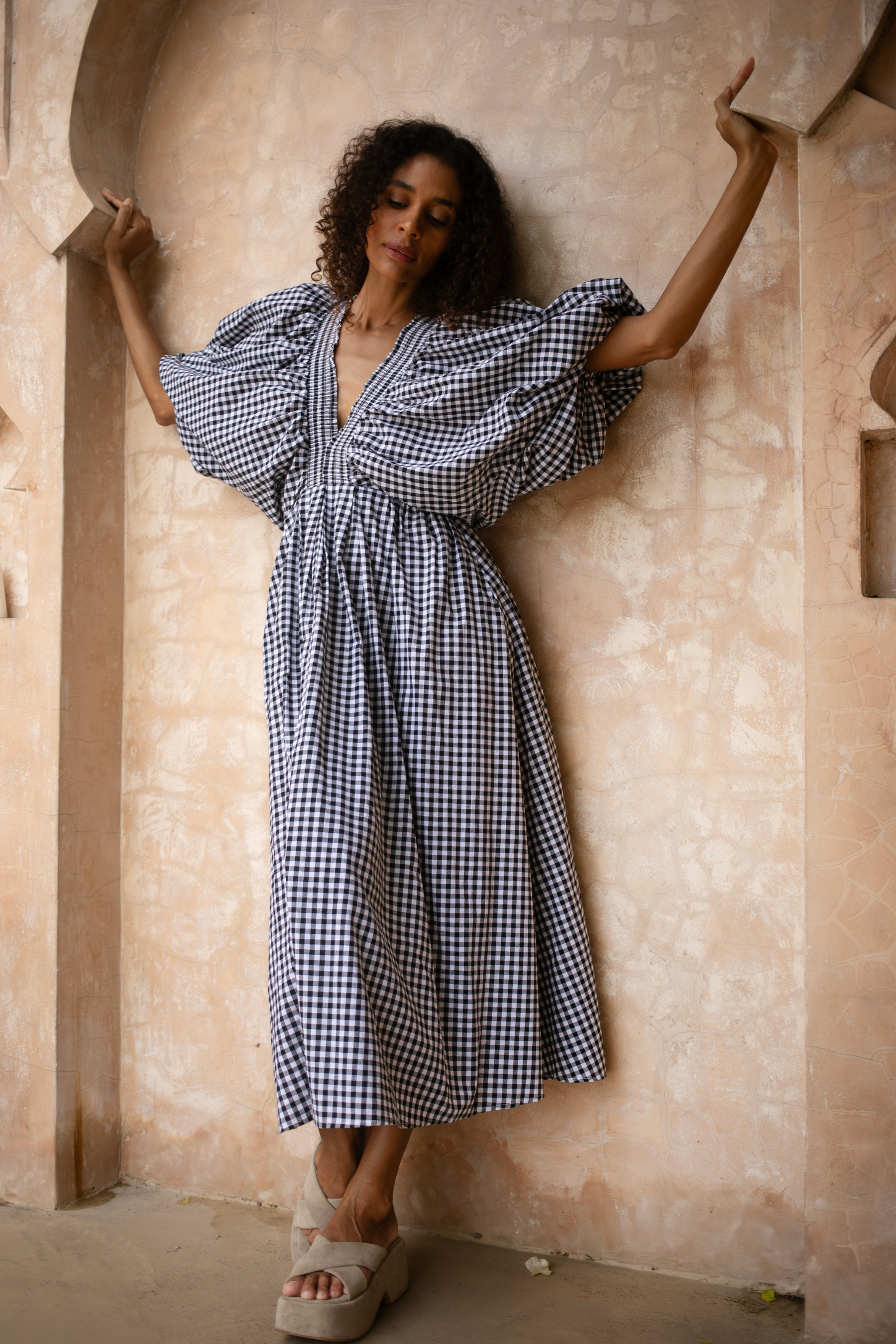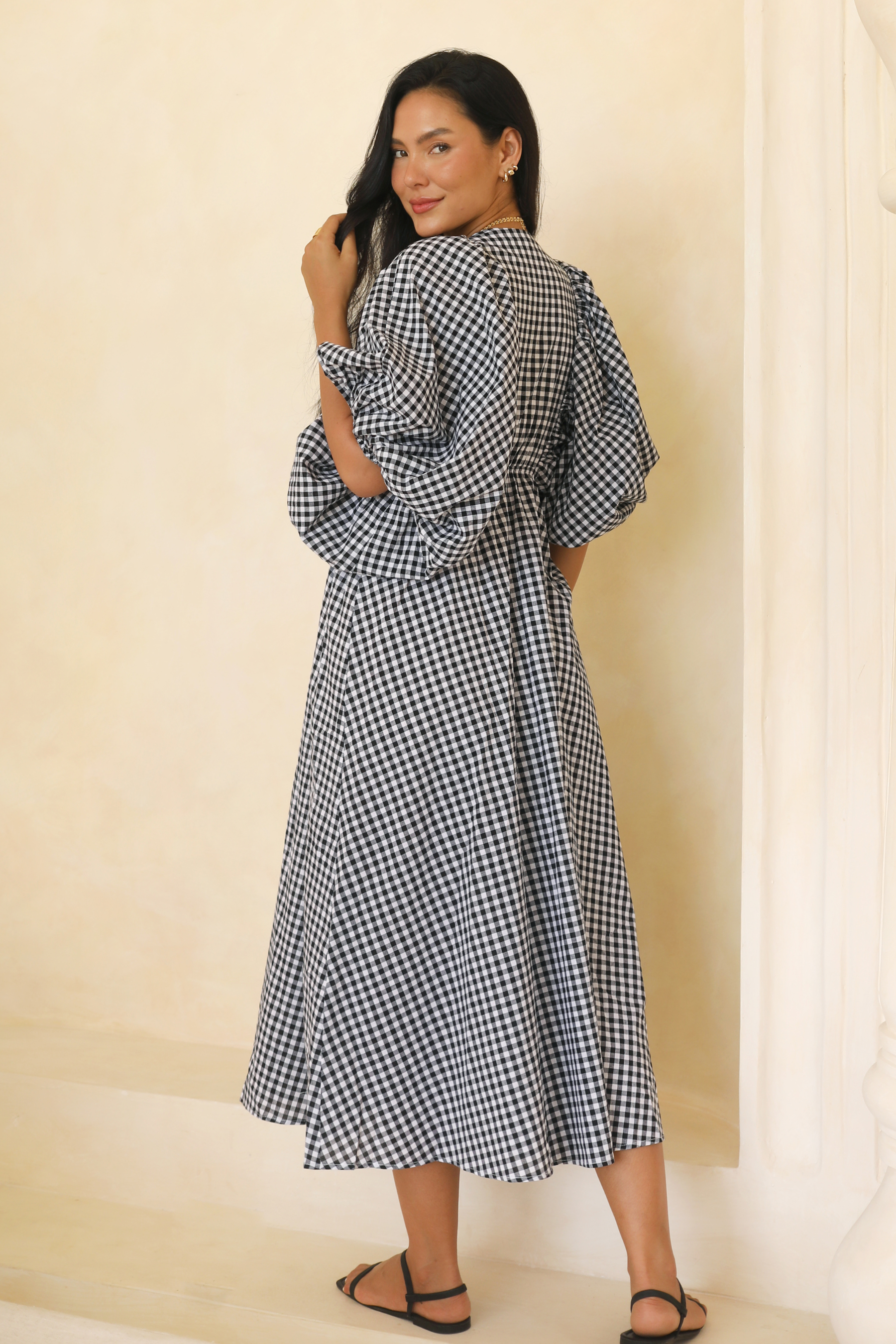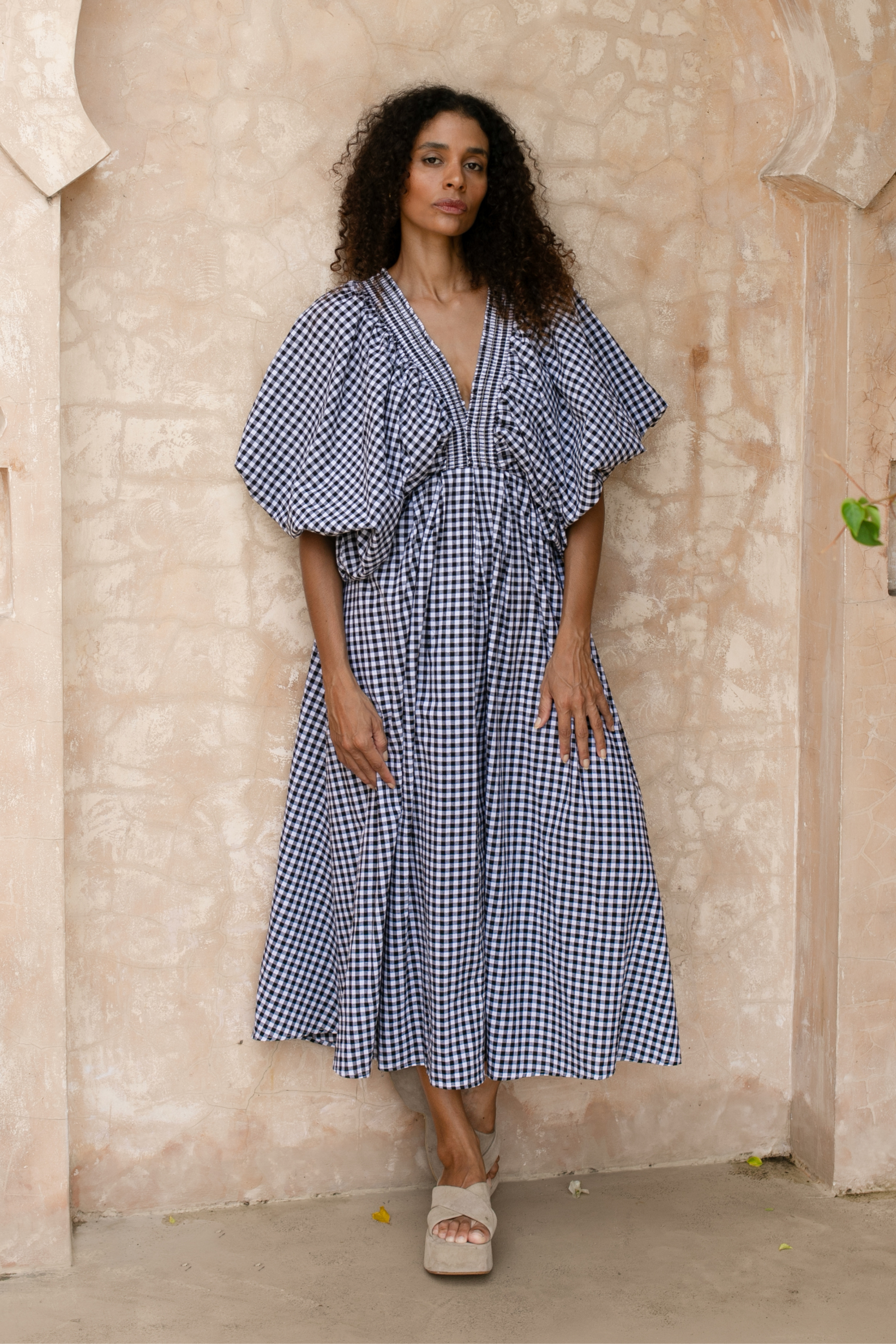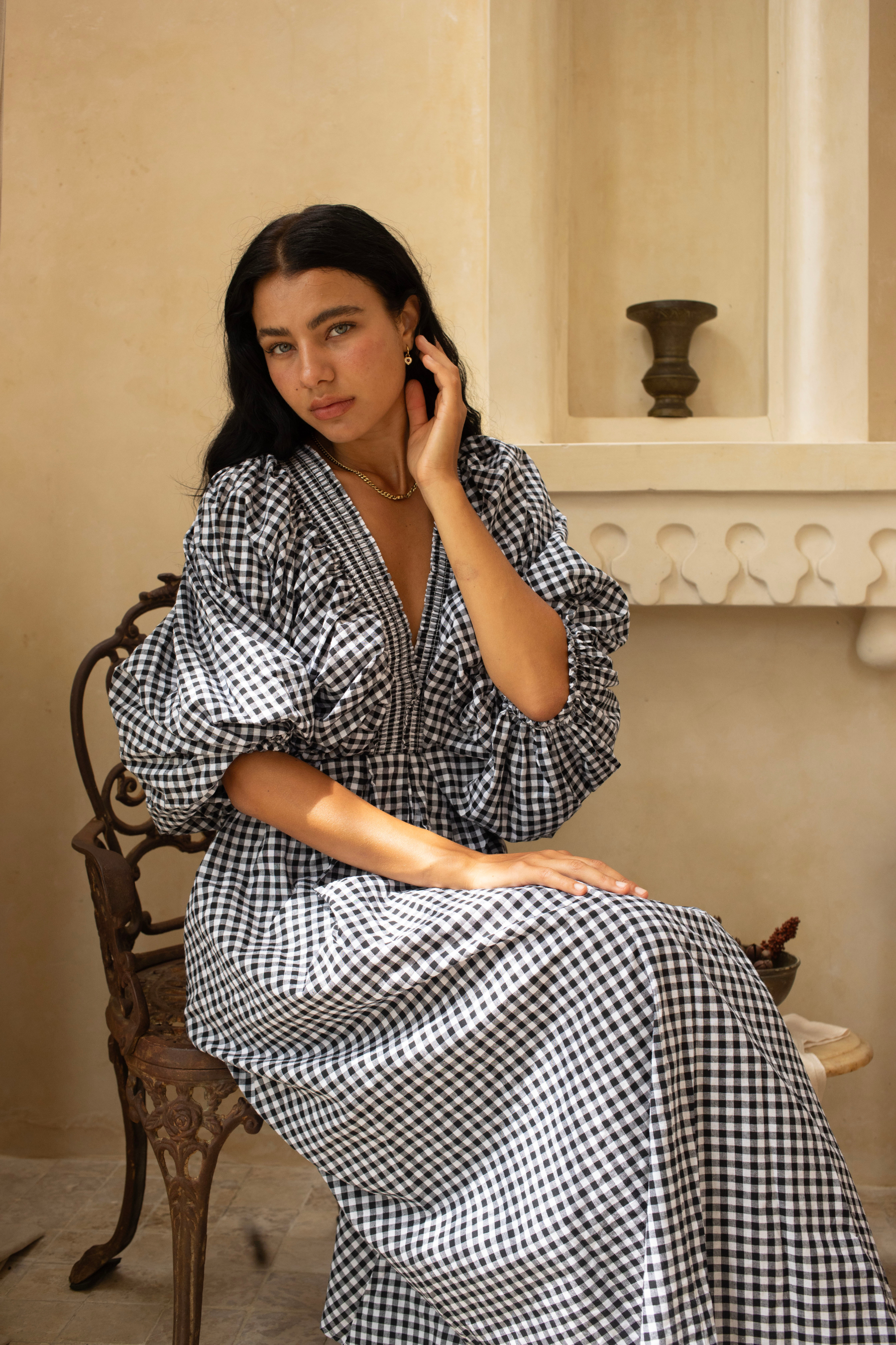 Crafted in an organic cotton timeless gingham print. It features playful balloon sleeves, a shirred neck detail, and a full, feminine skirt that moves with you.