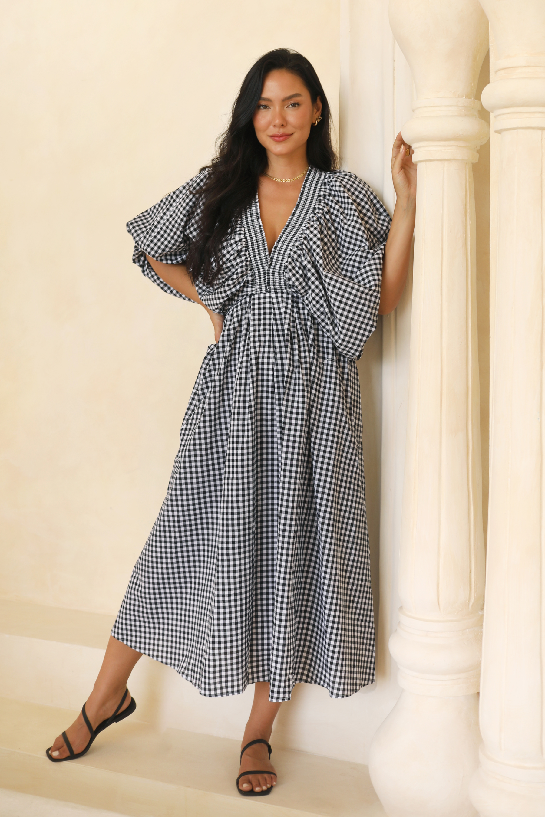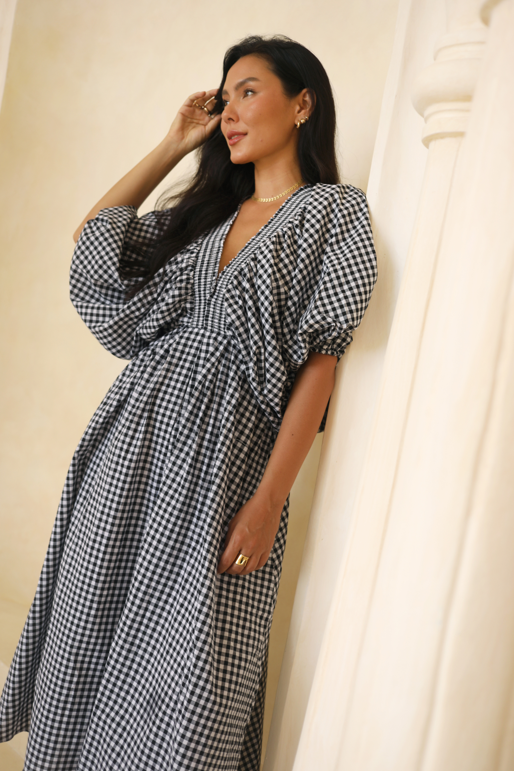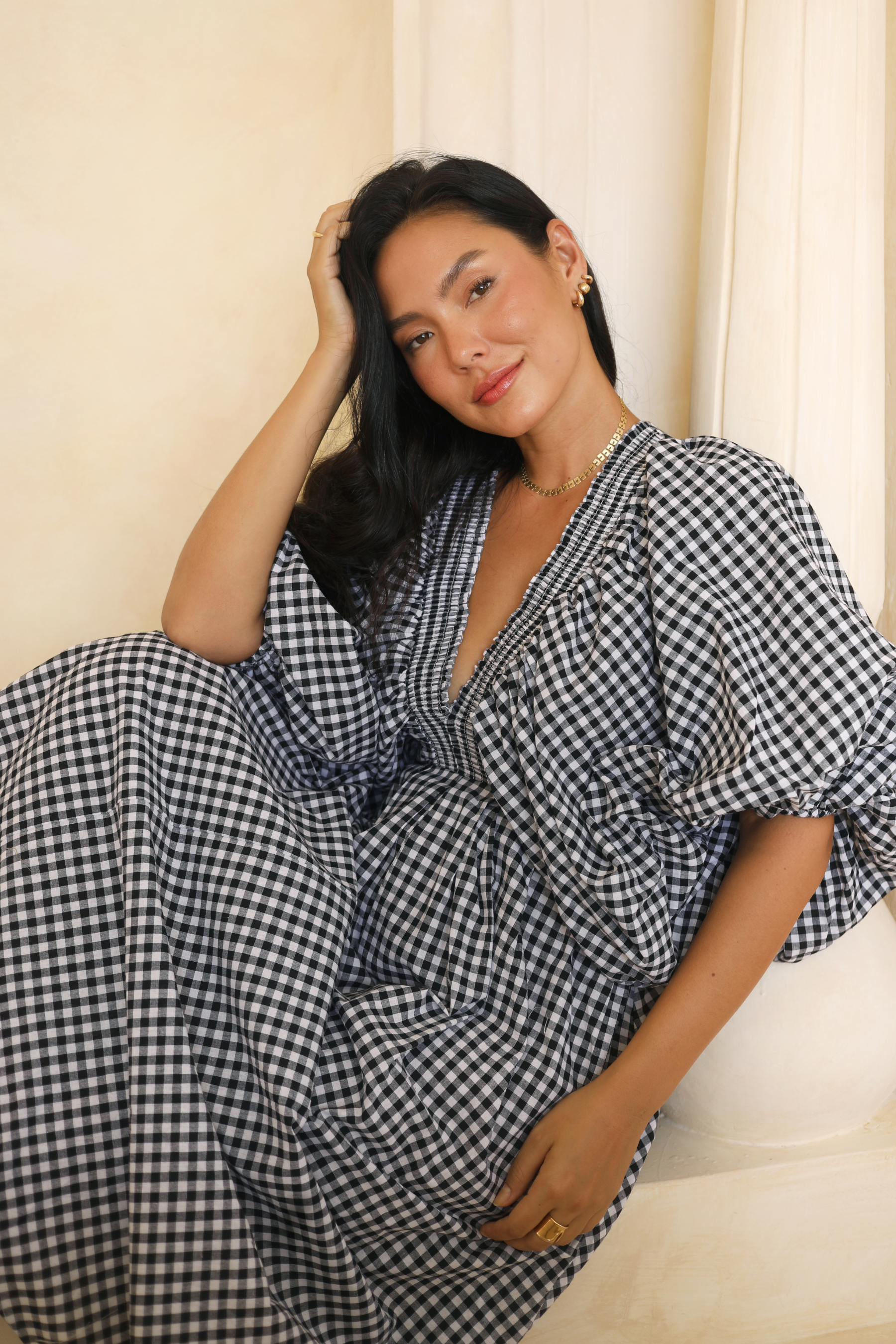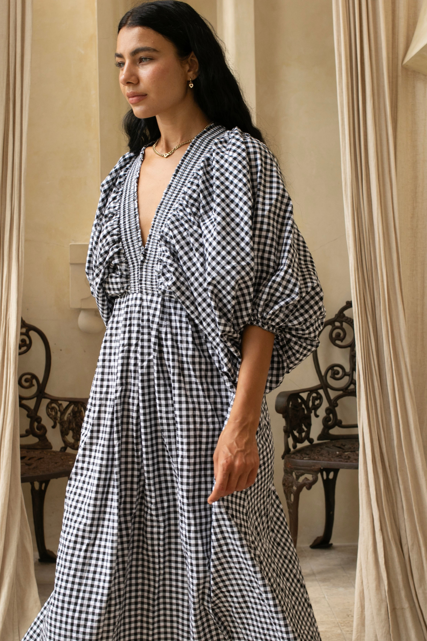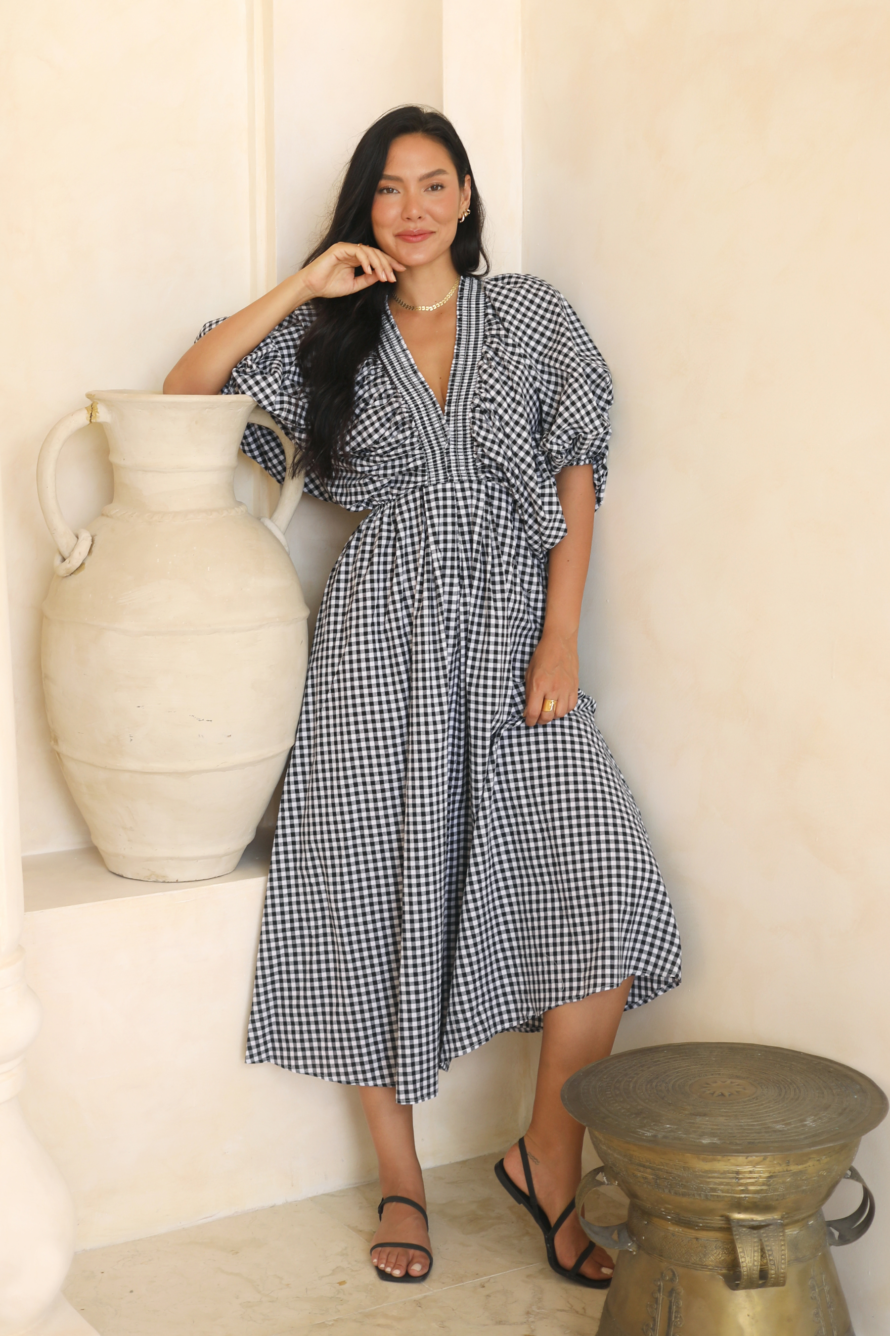 Crafted in an organic cotton timeless gingham print. It features playful balloon sleeves, a shirred neck detail, and a full, feminine skirt that moves with you.