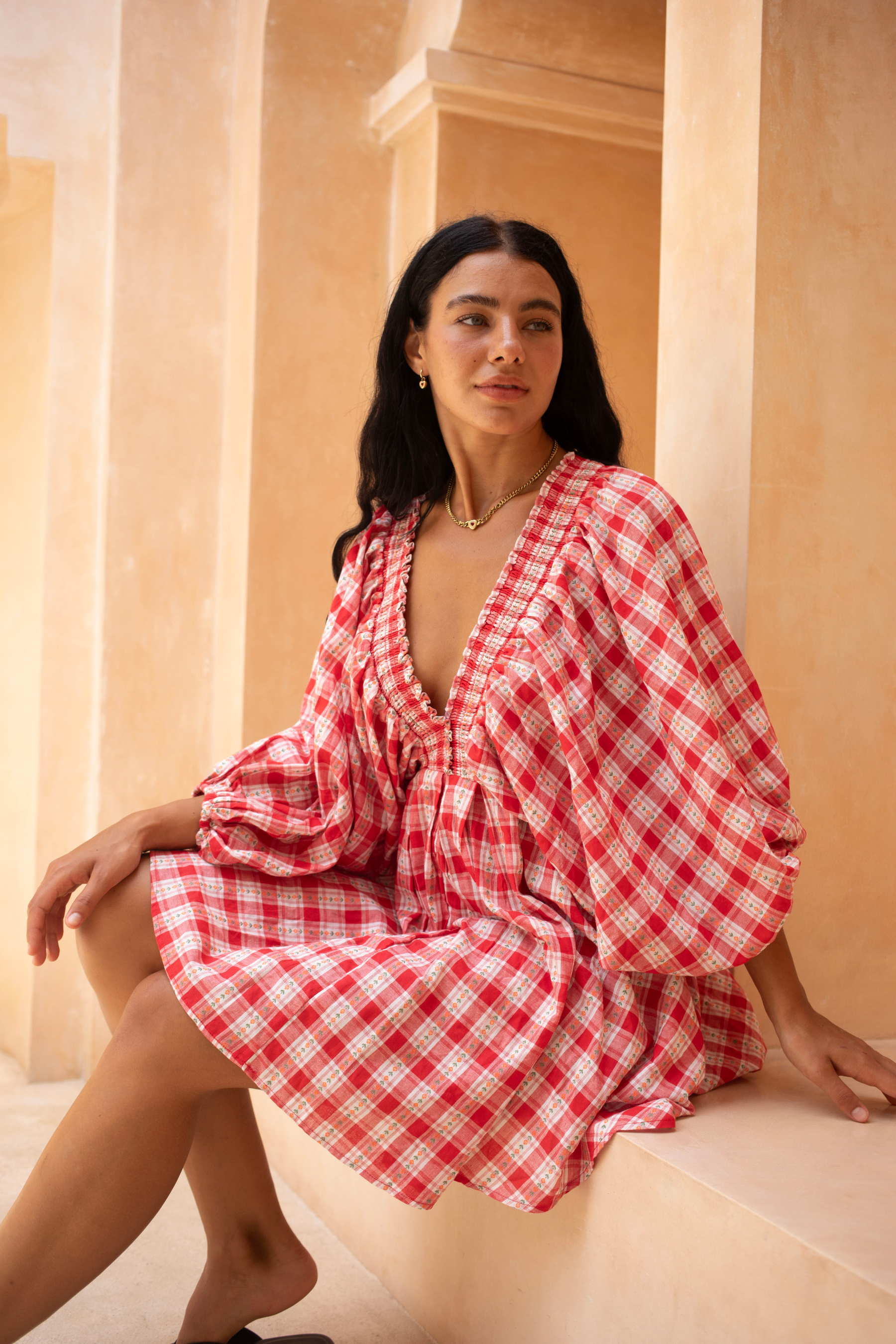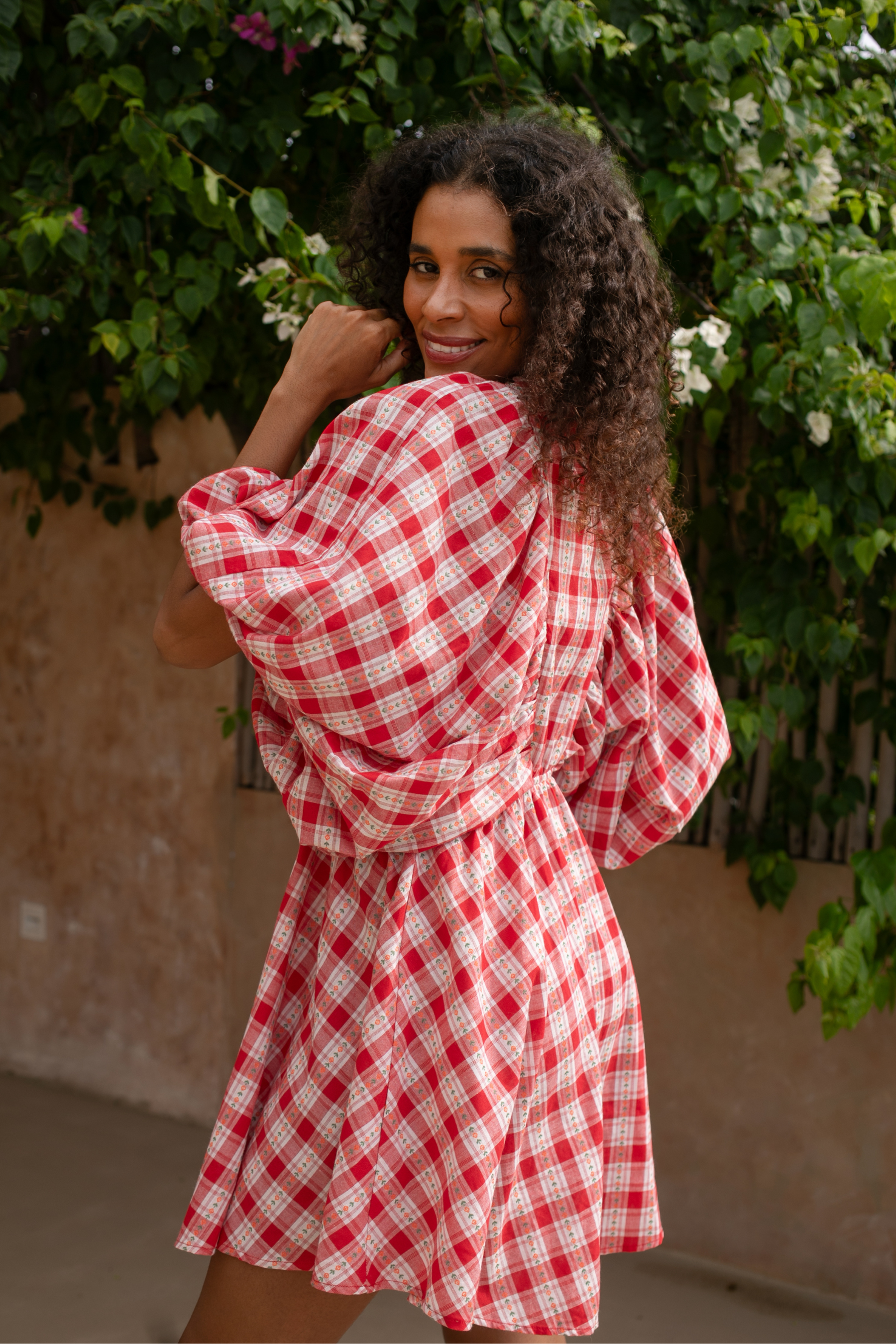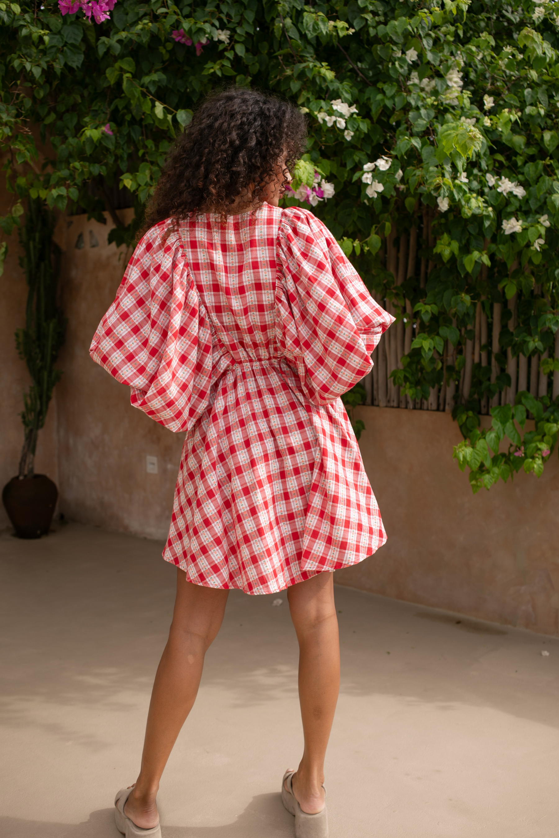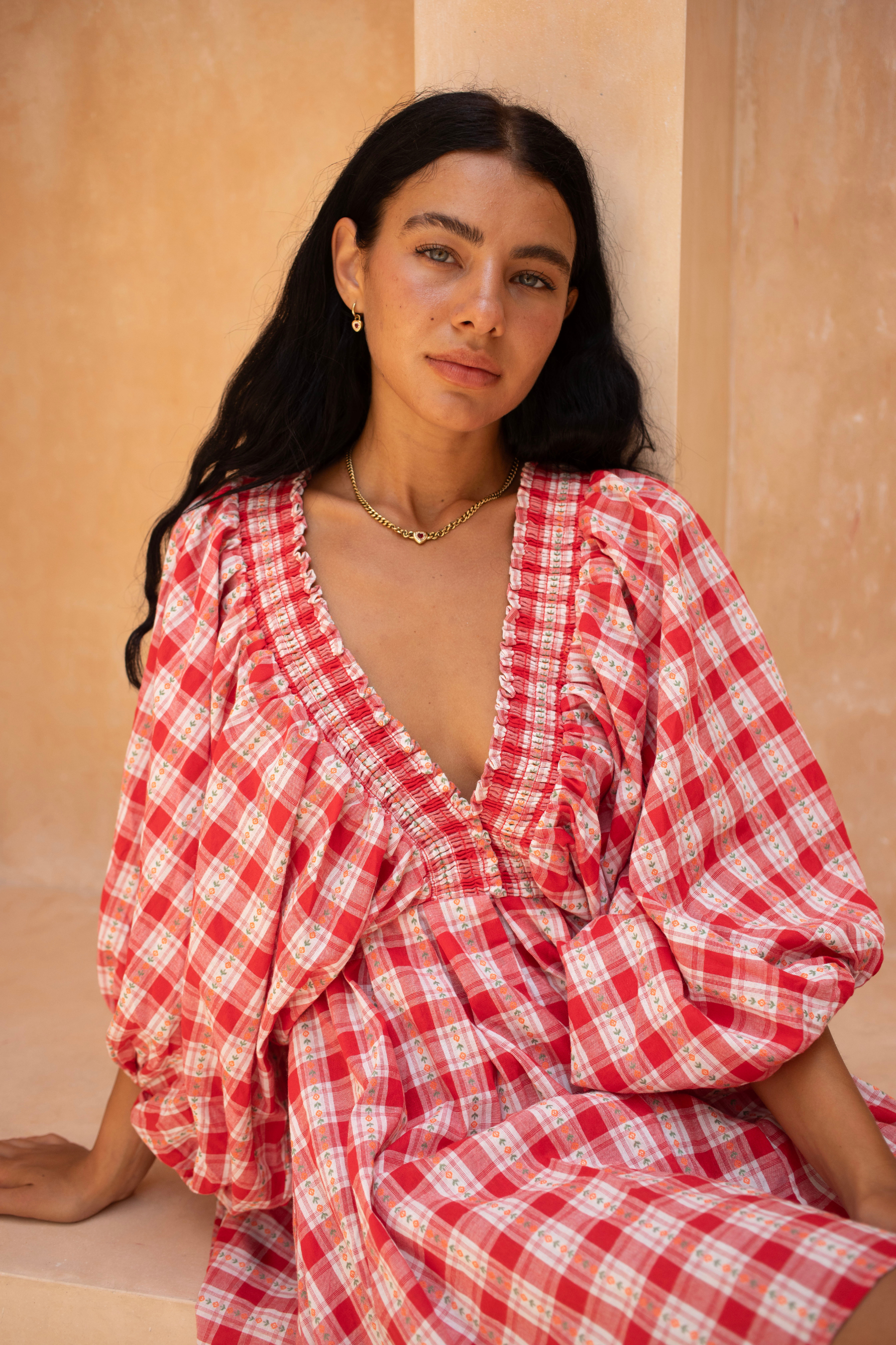 Crafted in an organic cotton timeless gingham print. It features playful balloon sleeves, a shirred neck detail, and a full, feminine skirt that moves with you.