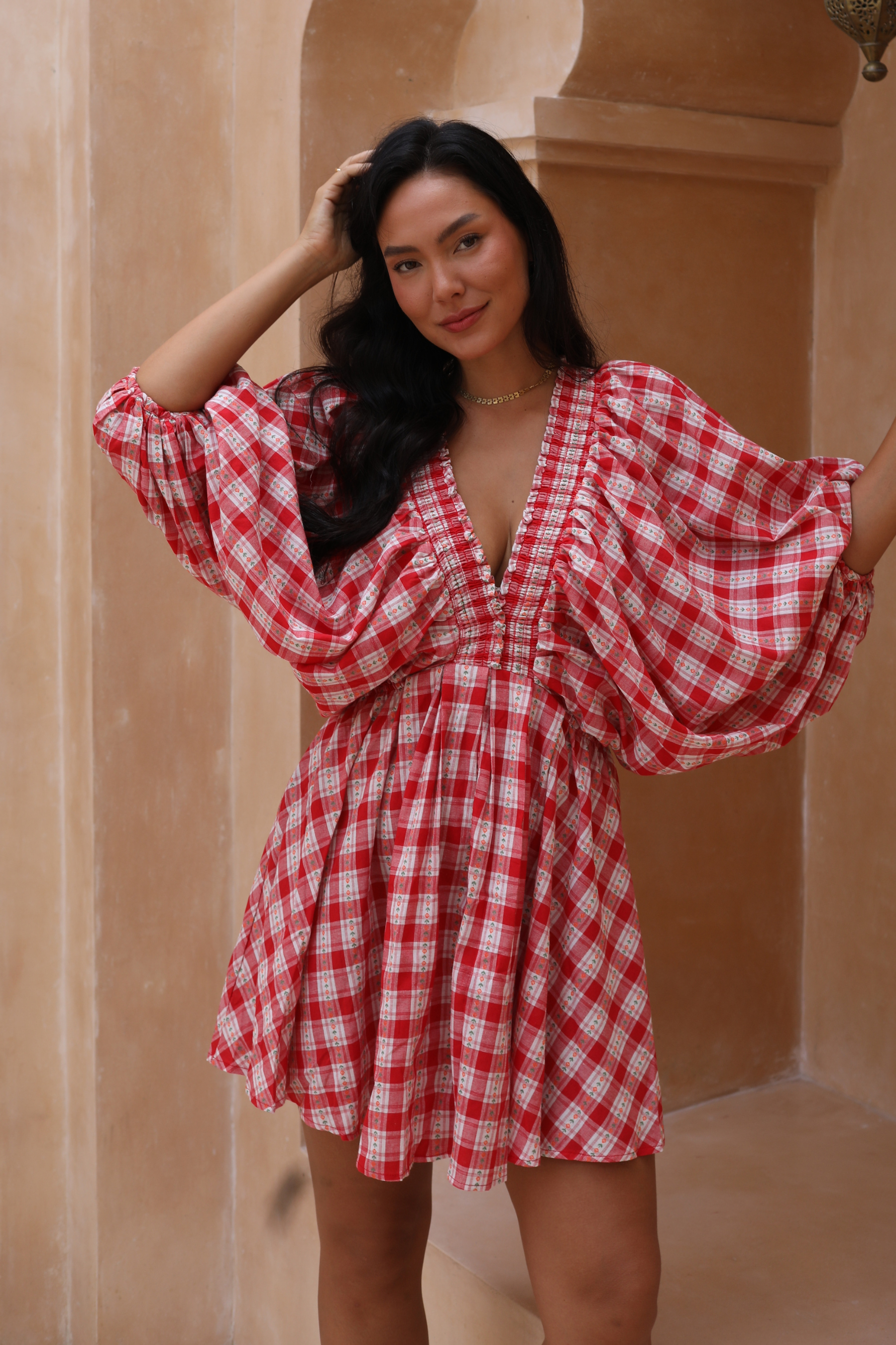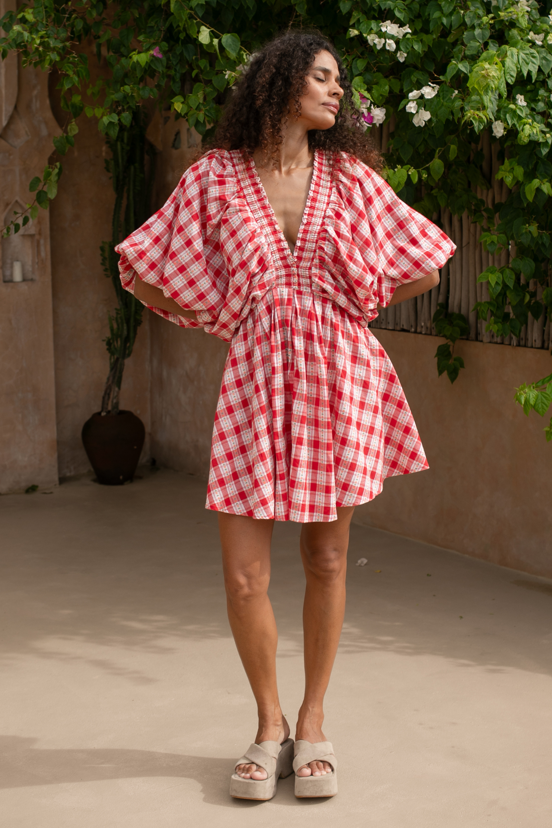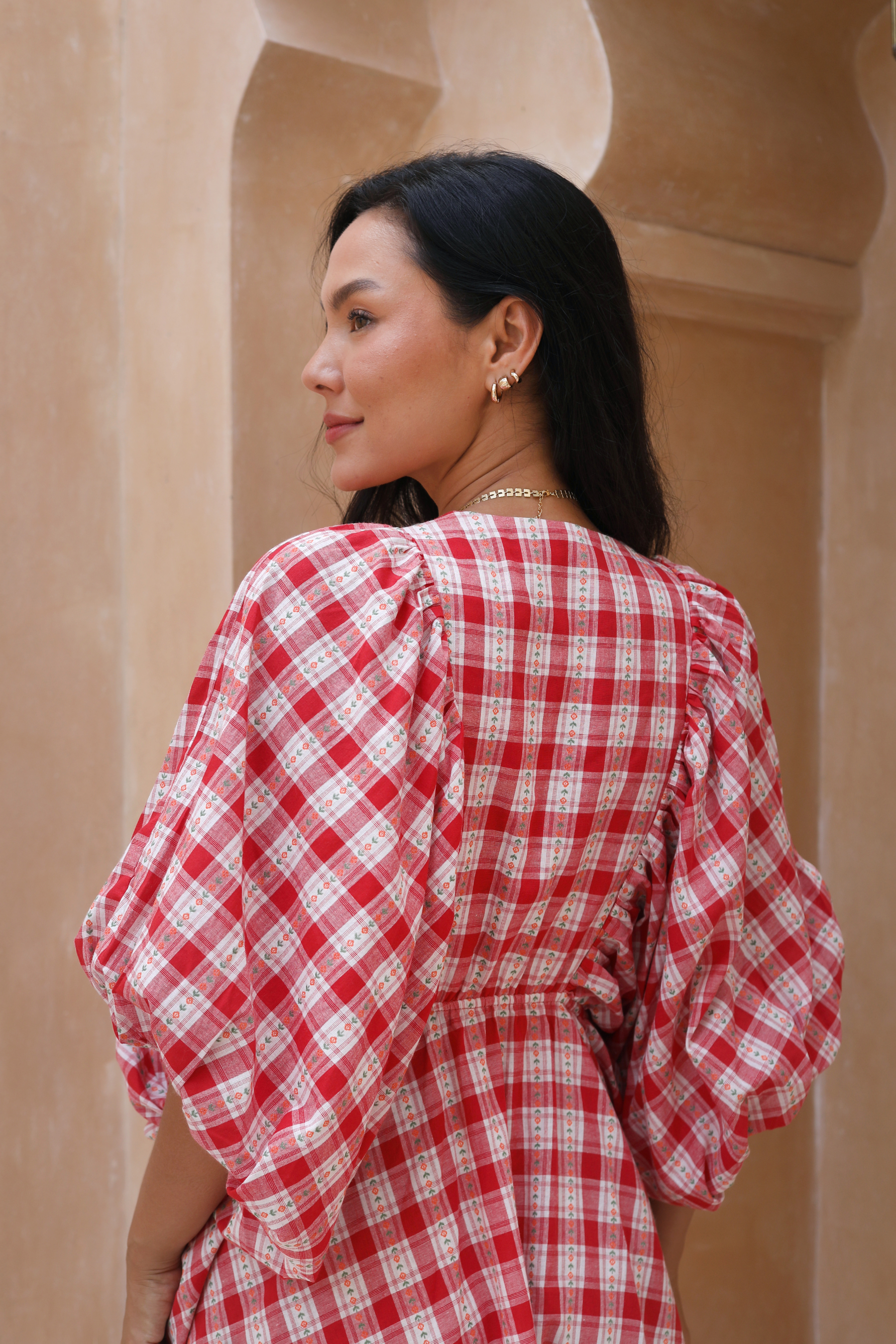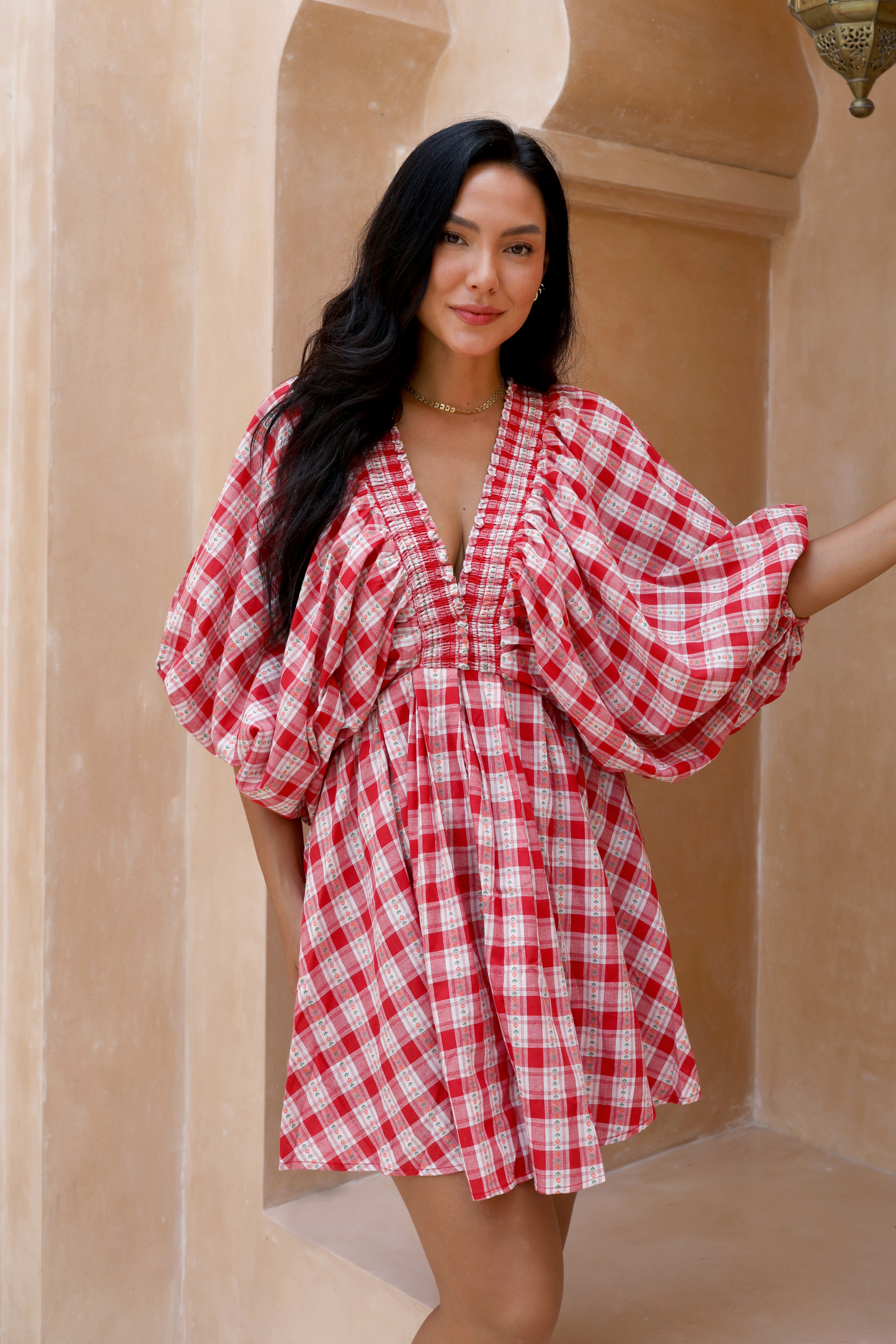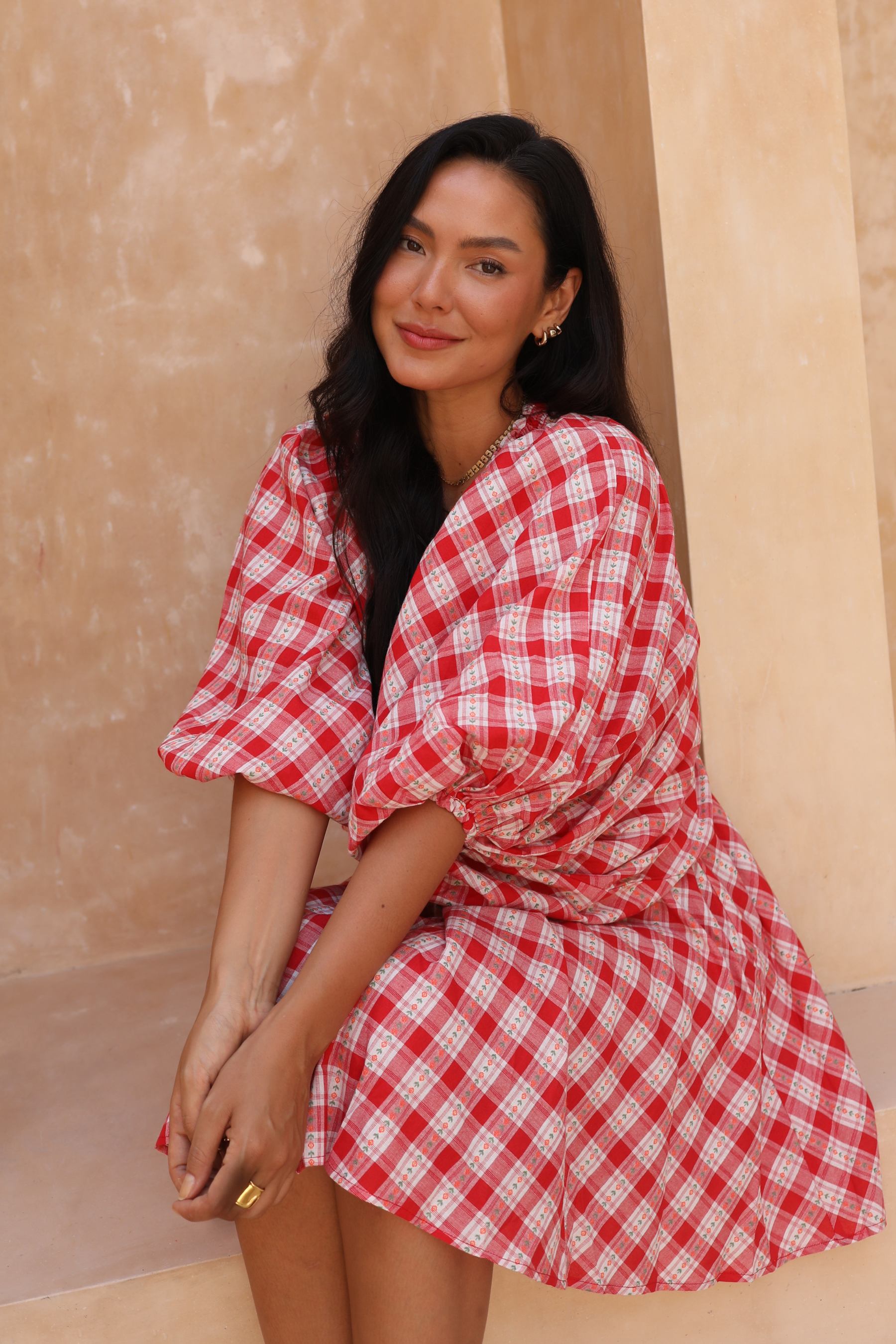 Crafted in an organic cotton timeless gingham print. It features playful balloon sleeves, a shirred neck detail, and a full, feminine skirt that moves with you.