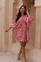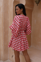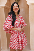 Crafted in an organic cotton timeless gingham print. It features playful balloon sleeves, a shirred neck detail, and a full, feminine skirt that moves with you.