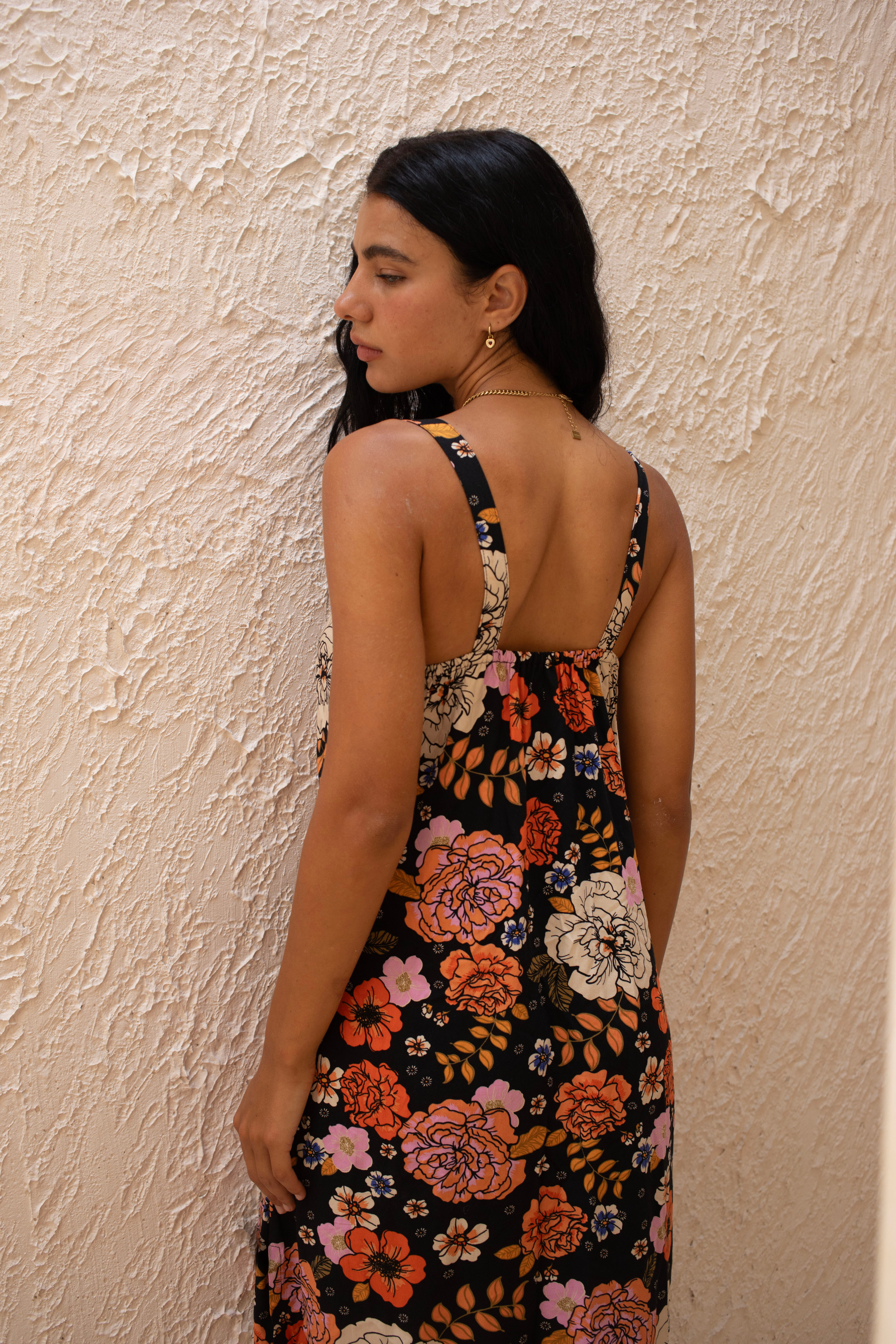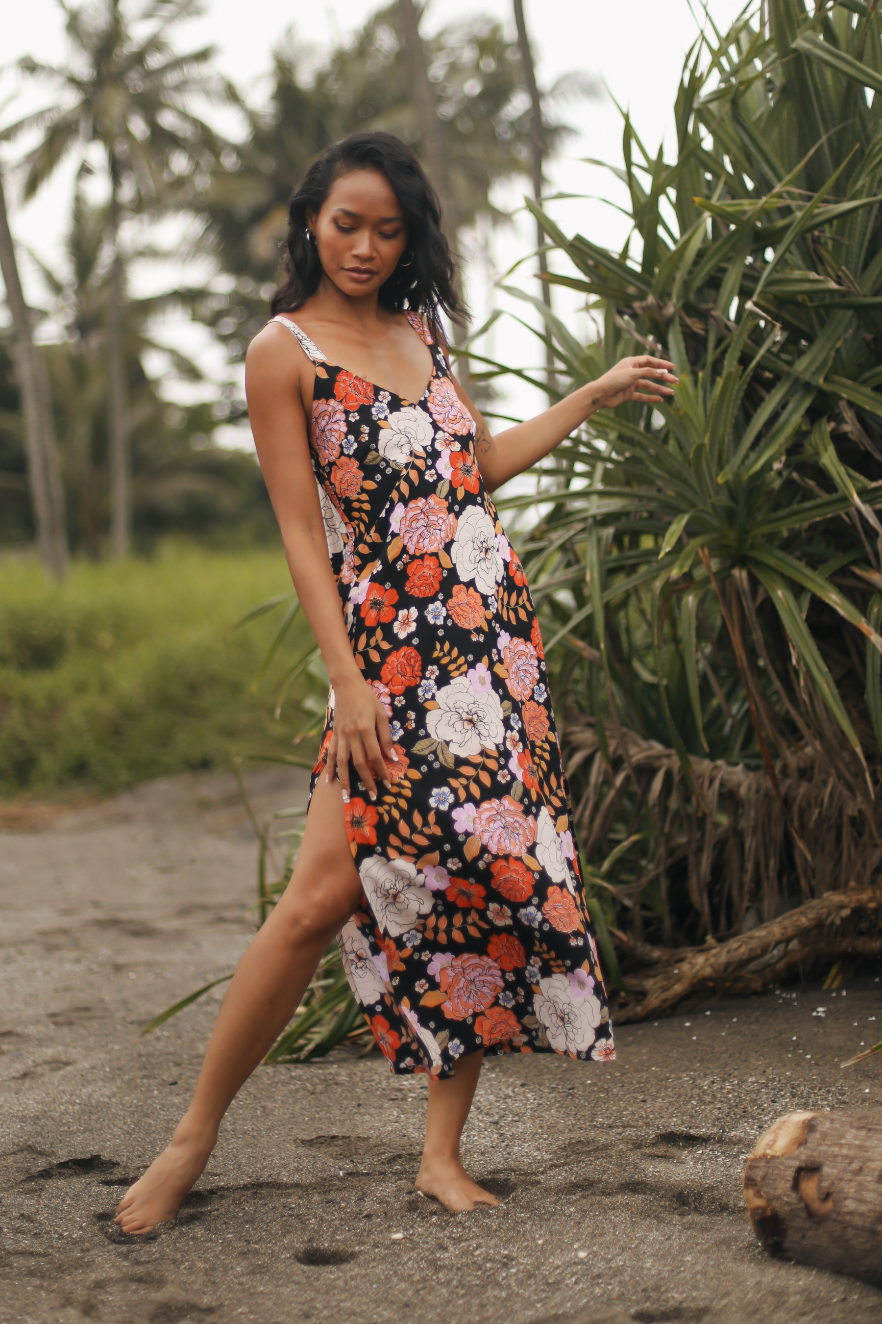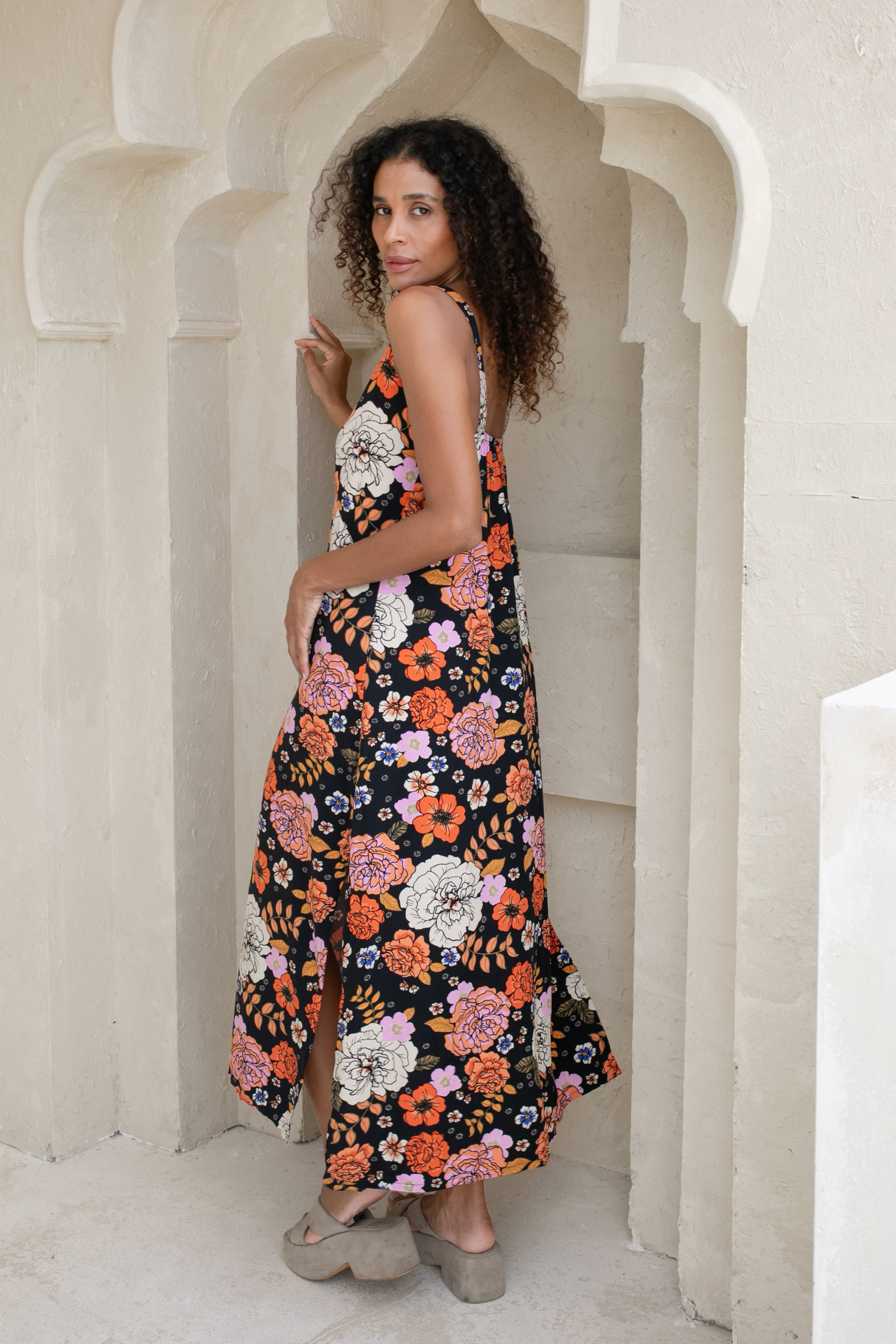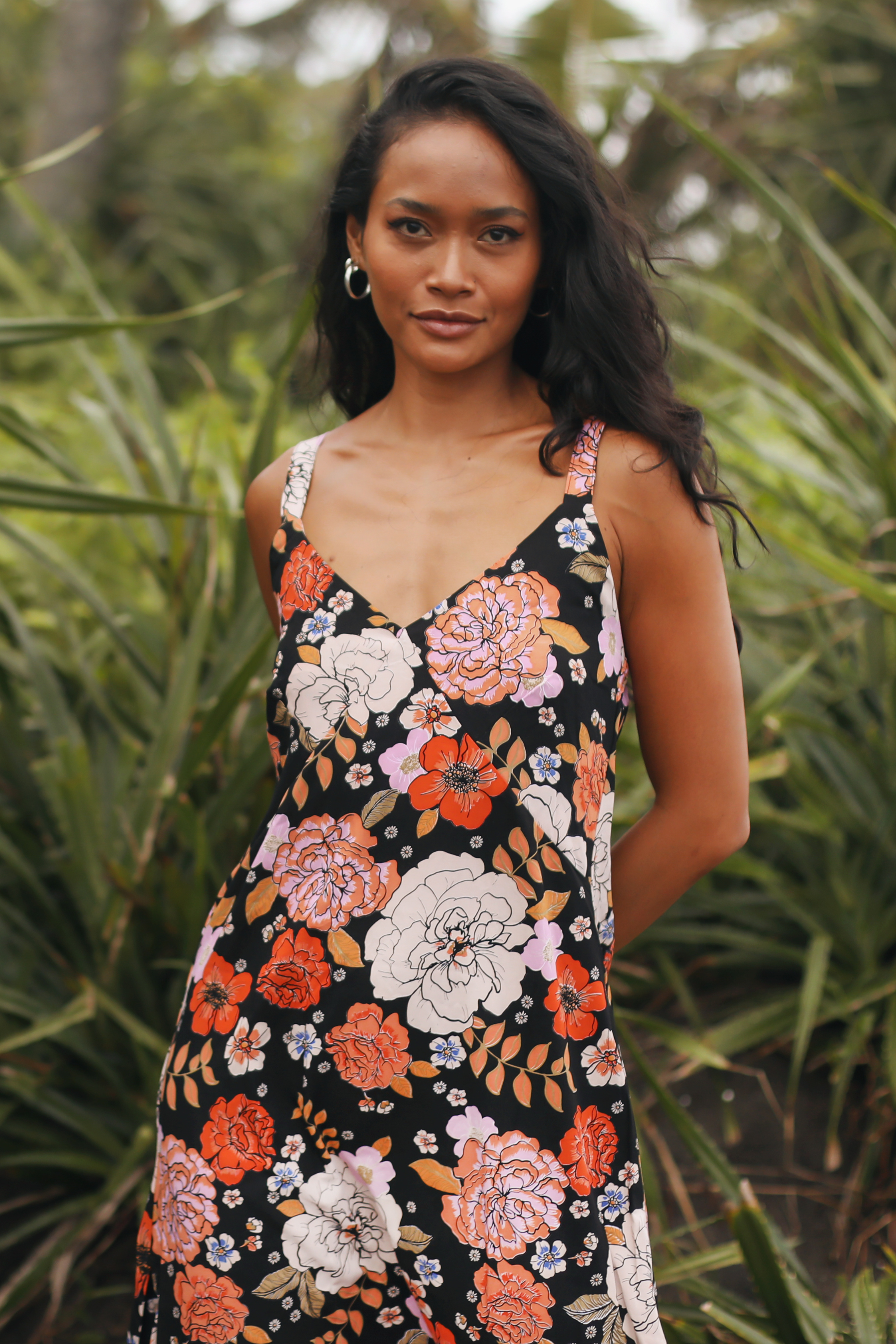 We are absolutely swooning over this Gardenia Black Midi Dress featuring our signature floral motif. A simple slip style in a bias cut, this midi perfectly skims the body.