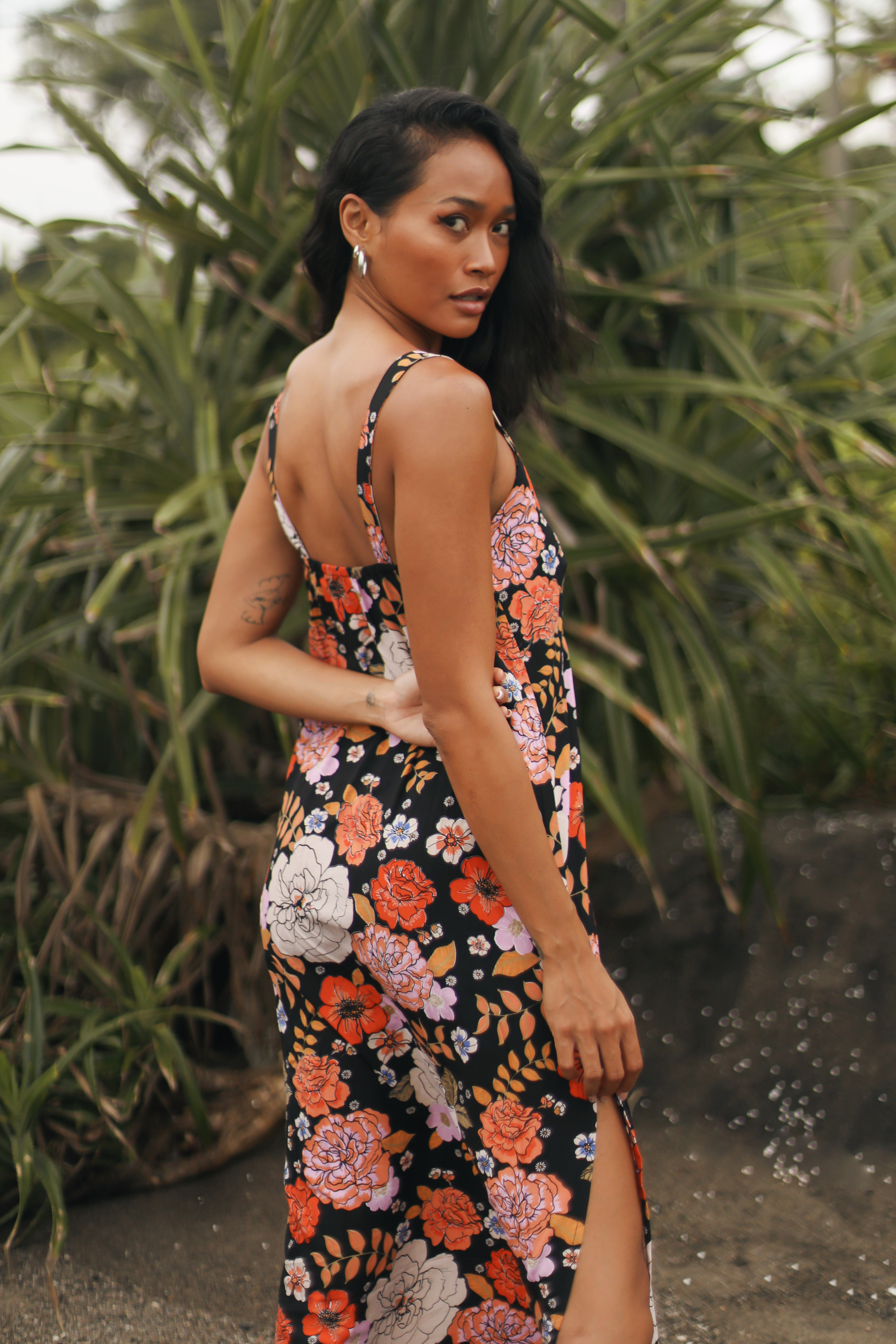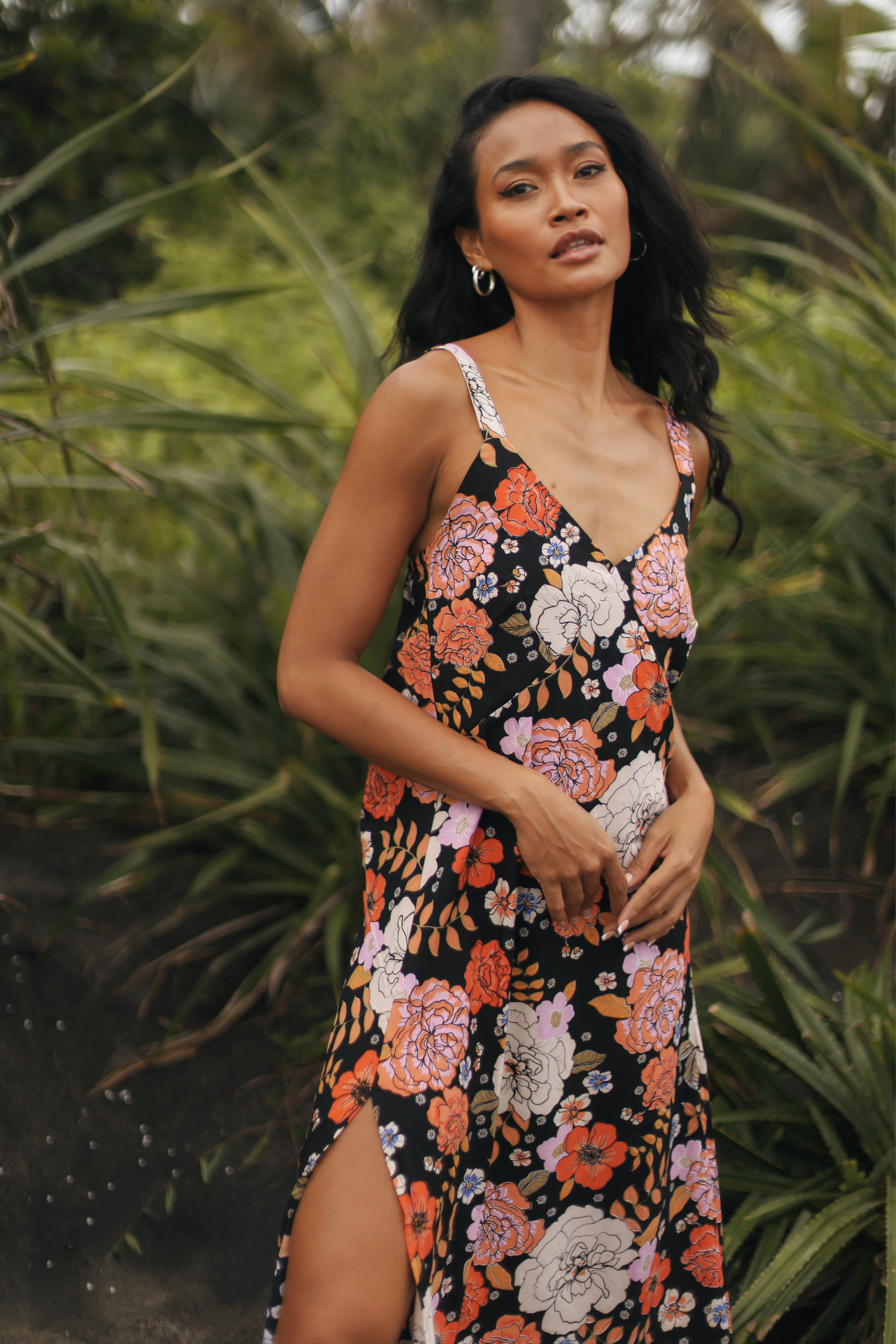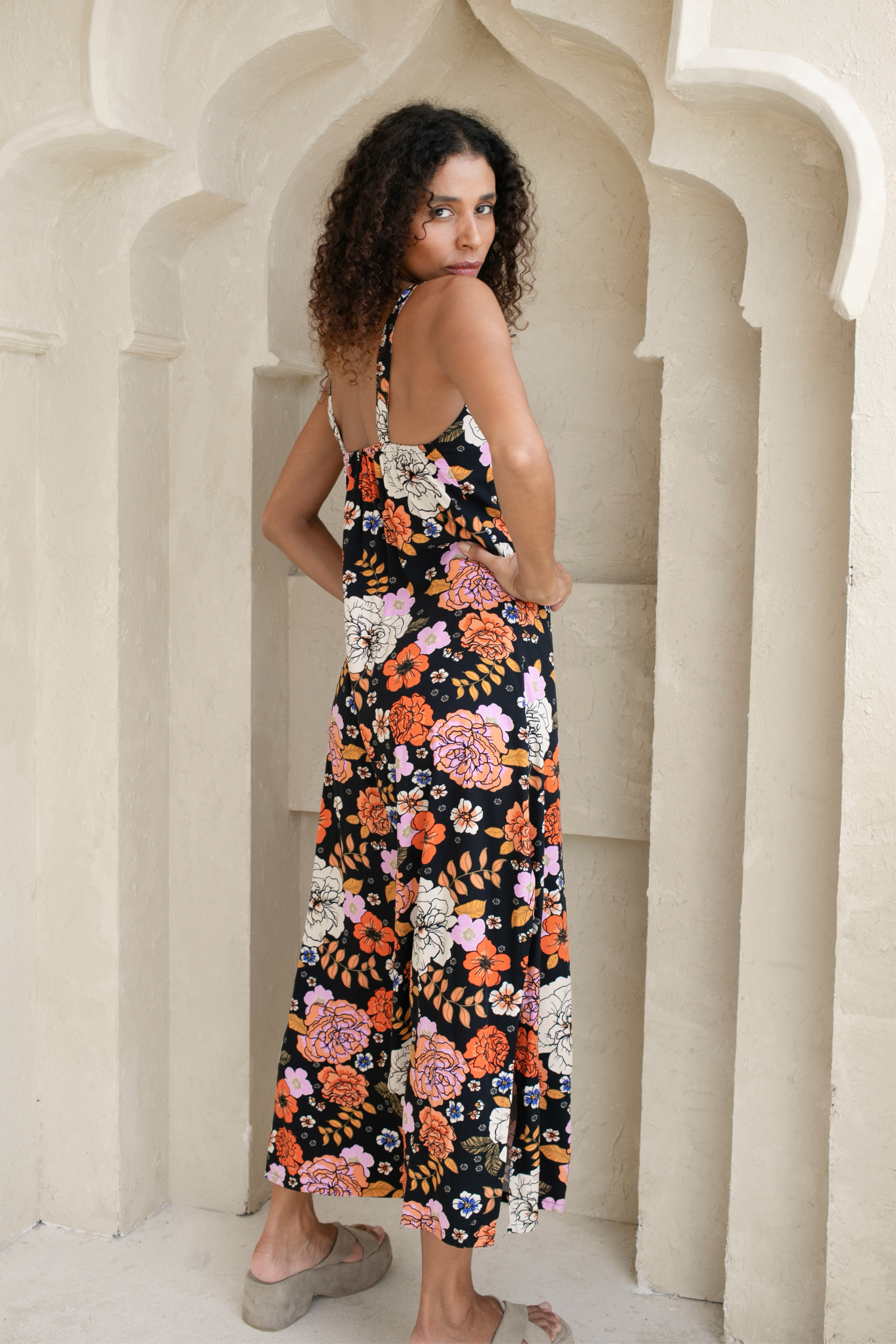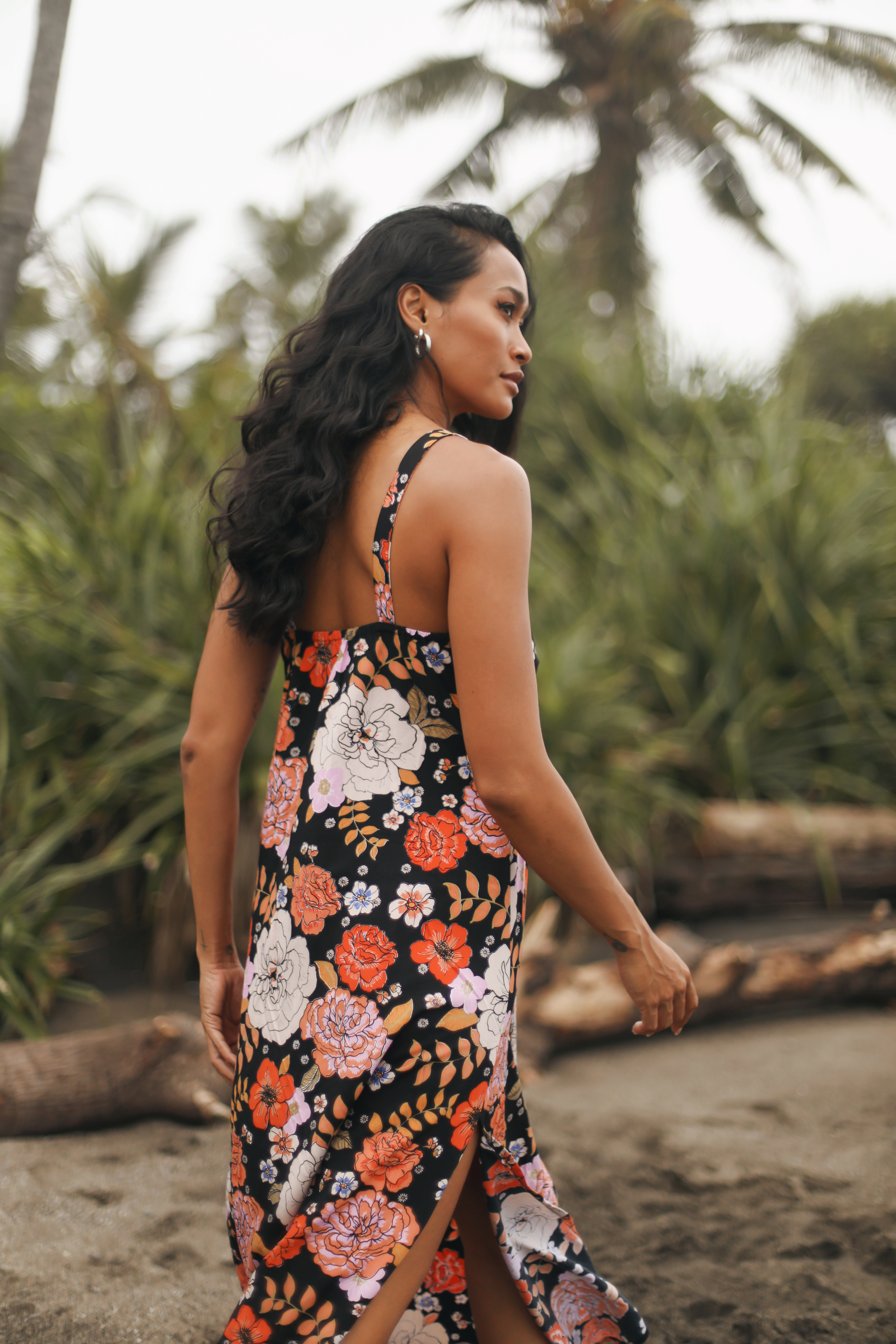 We are absolutely swooning over this Gardenia Black Midi Dress featuring our signature floral motif. A simple slip style in a bias cut, this midi perfectly skims the body.
