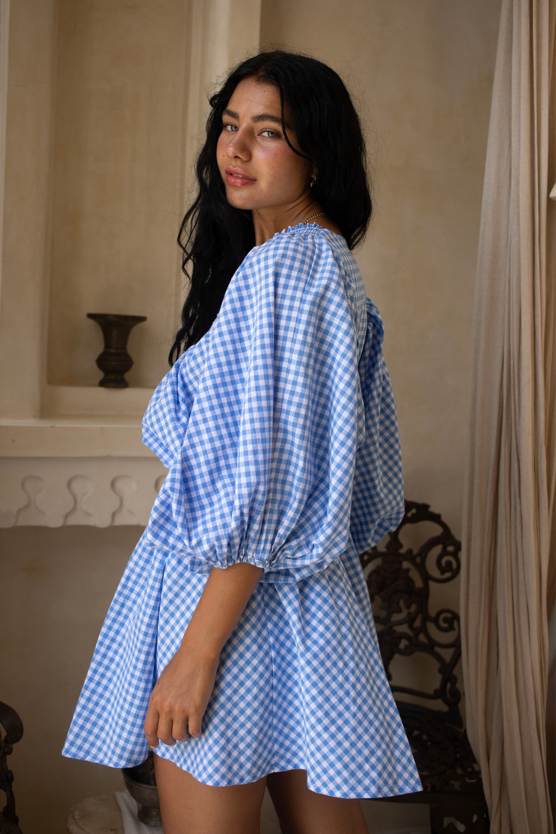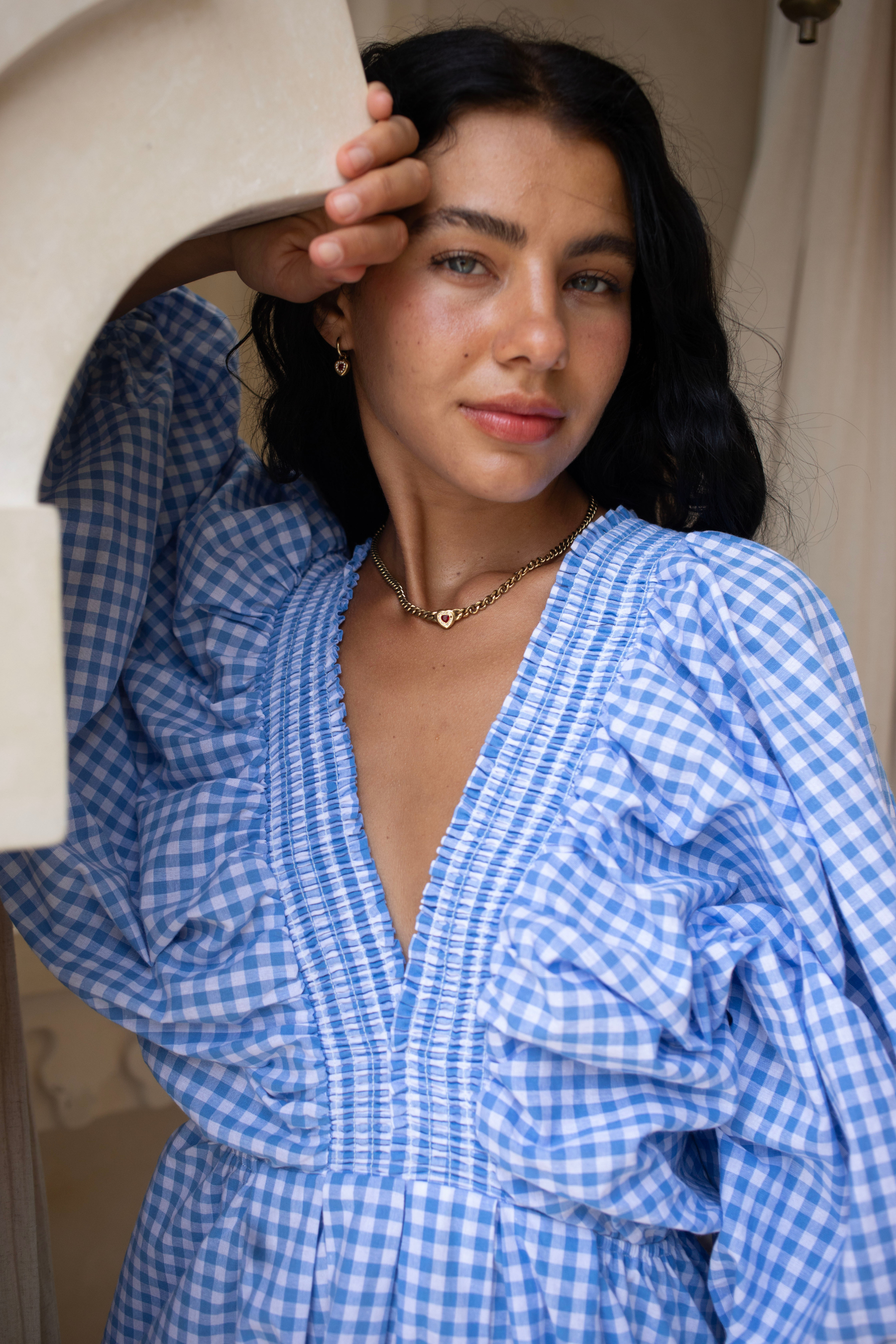 Crafted in an organic cotton timeless gingham print. It features playful balloon sleeves, a shirred neck detail, and a full, feminine skirt that moves with you.
